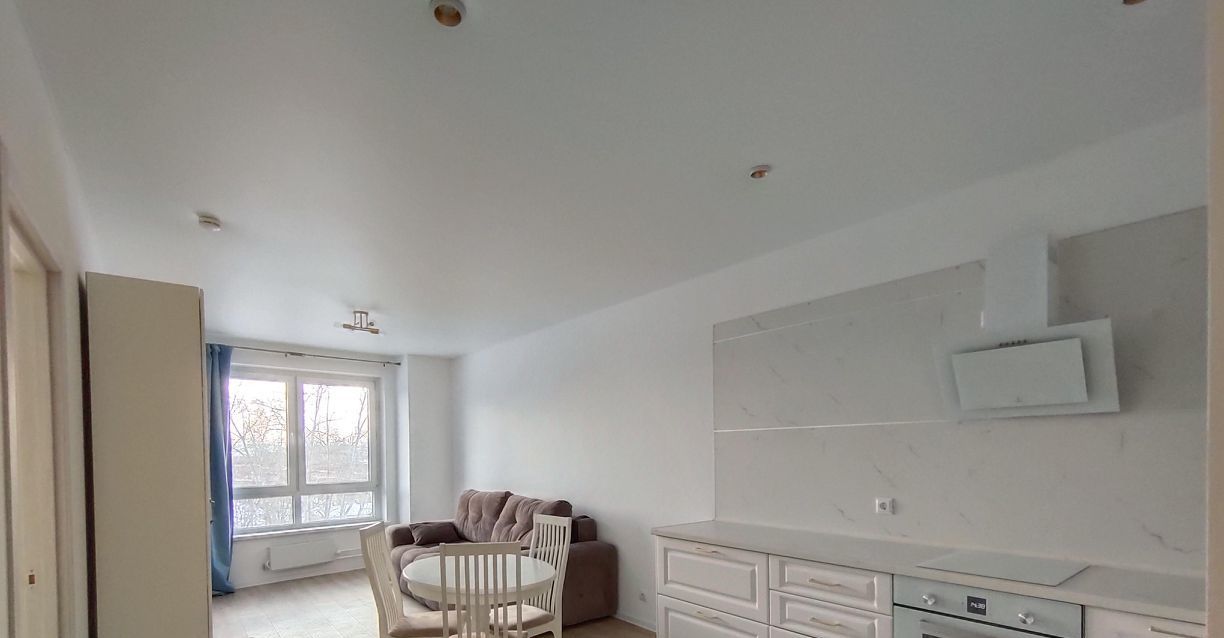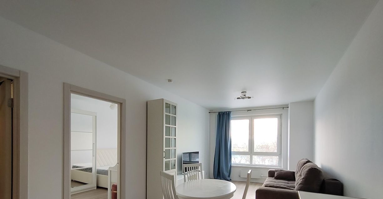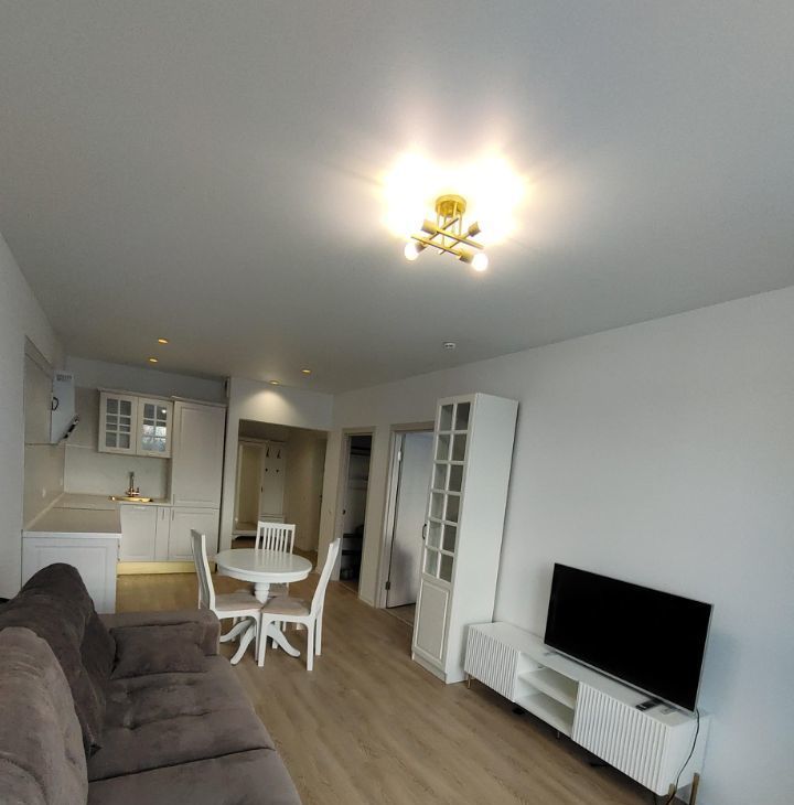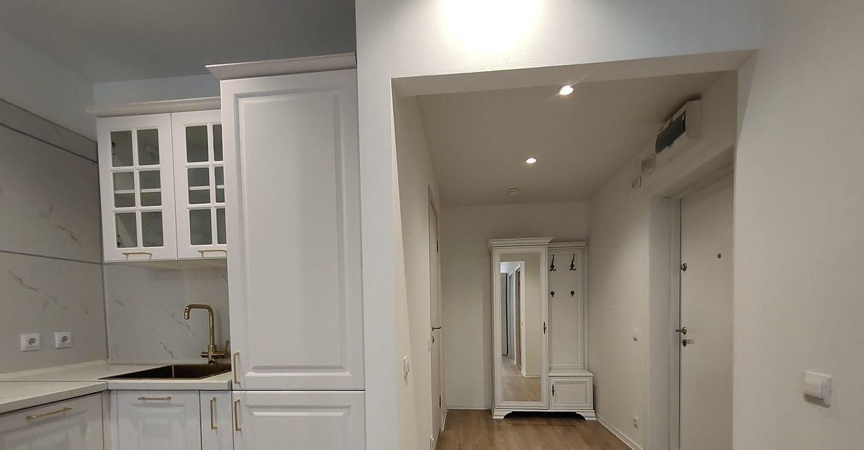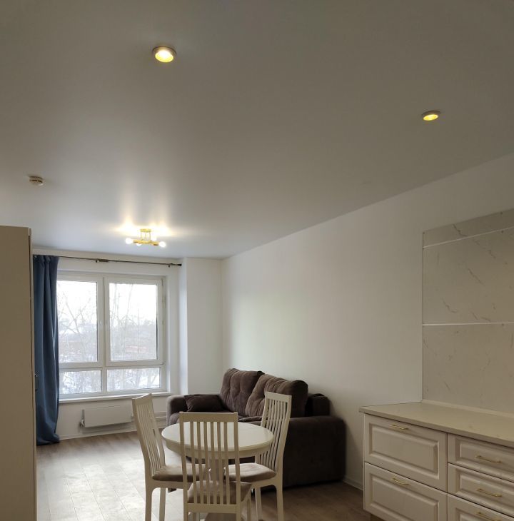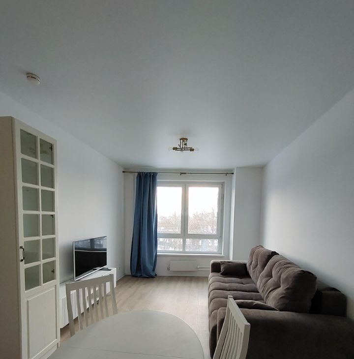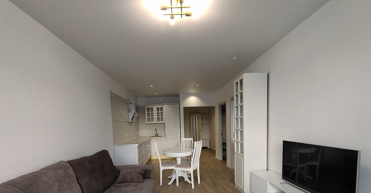 В основной комнате - раскладной двуспальный диван, смарт-телевизор, стол со стульями, шкаф, встроенная кухня с посудомоечной машиной и индукционной плитой, холодильник. Есть кондиционер, но сплит систему установят весной. Интернет подключат при заселении.