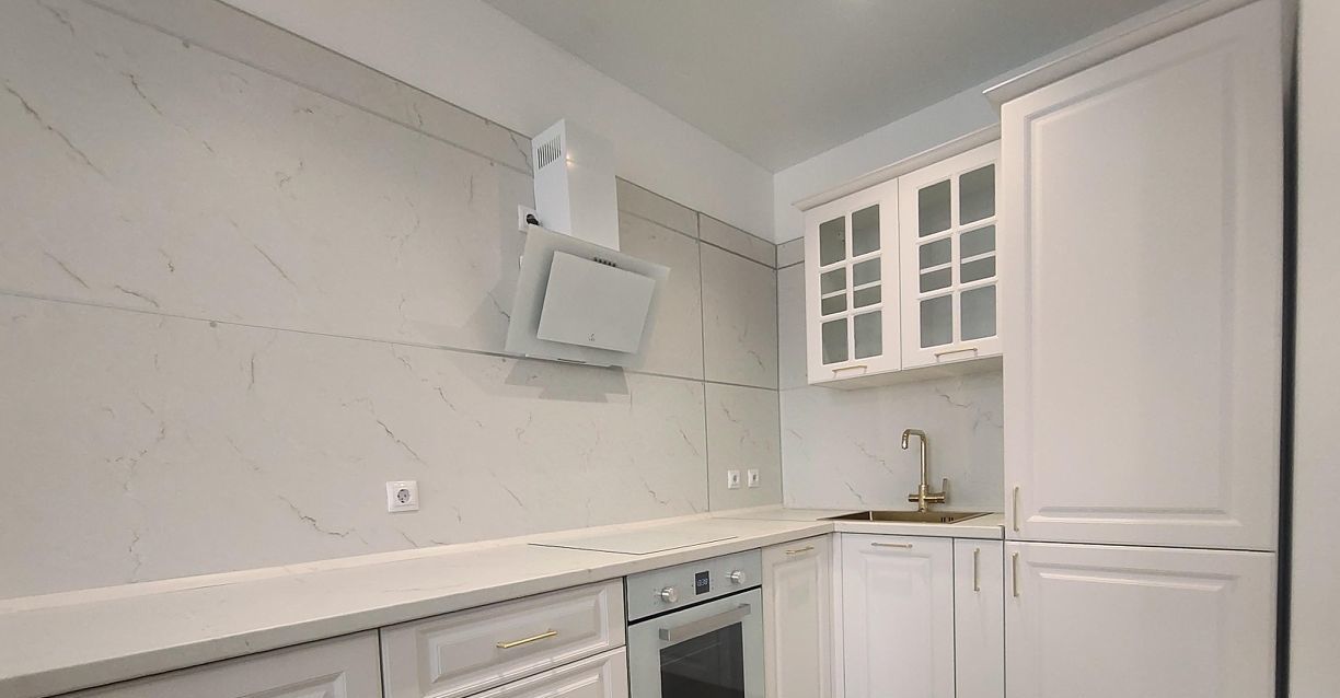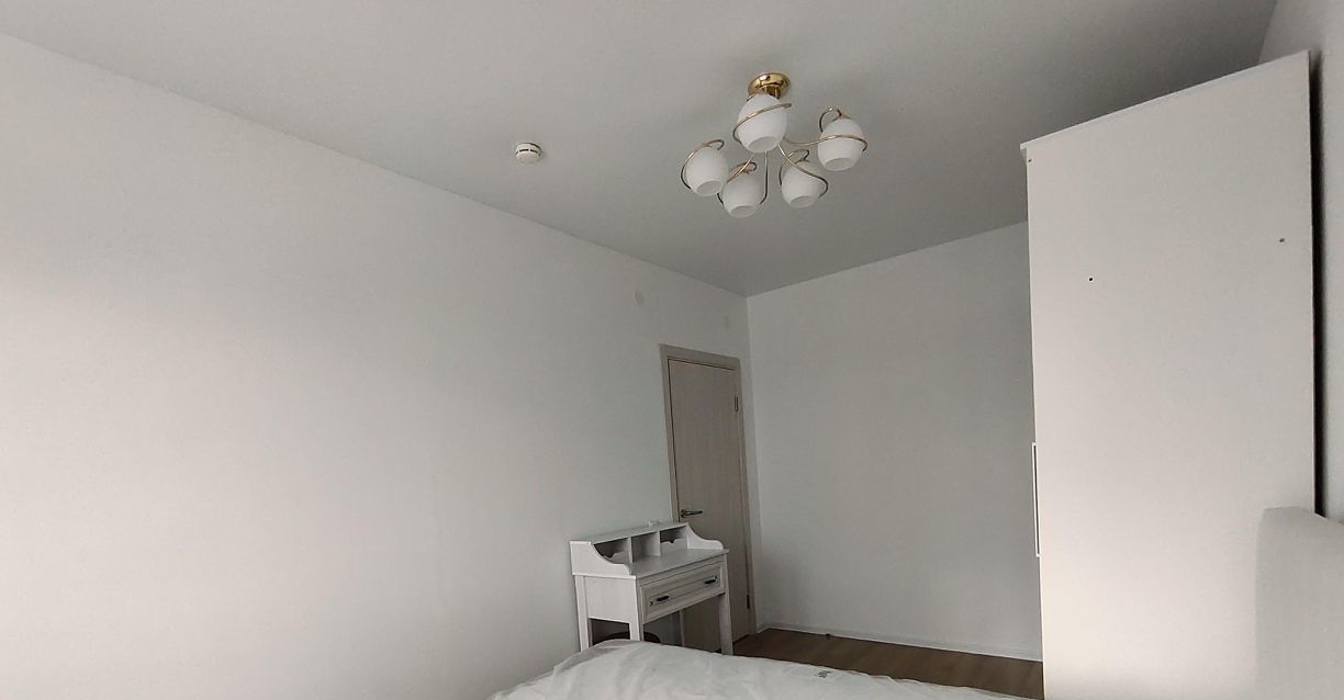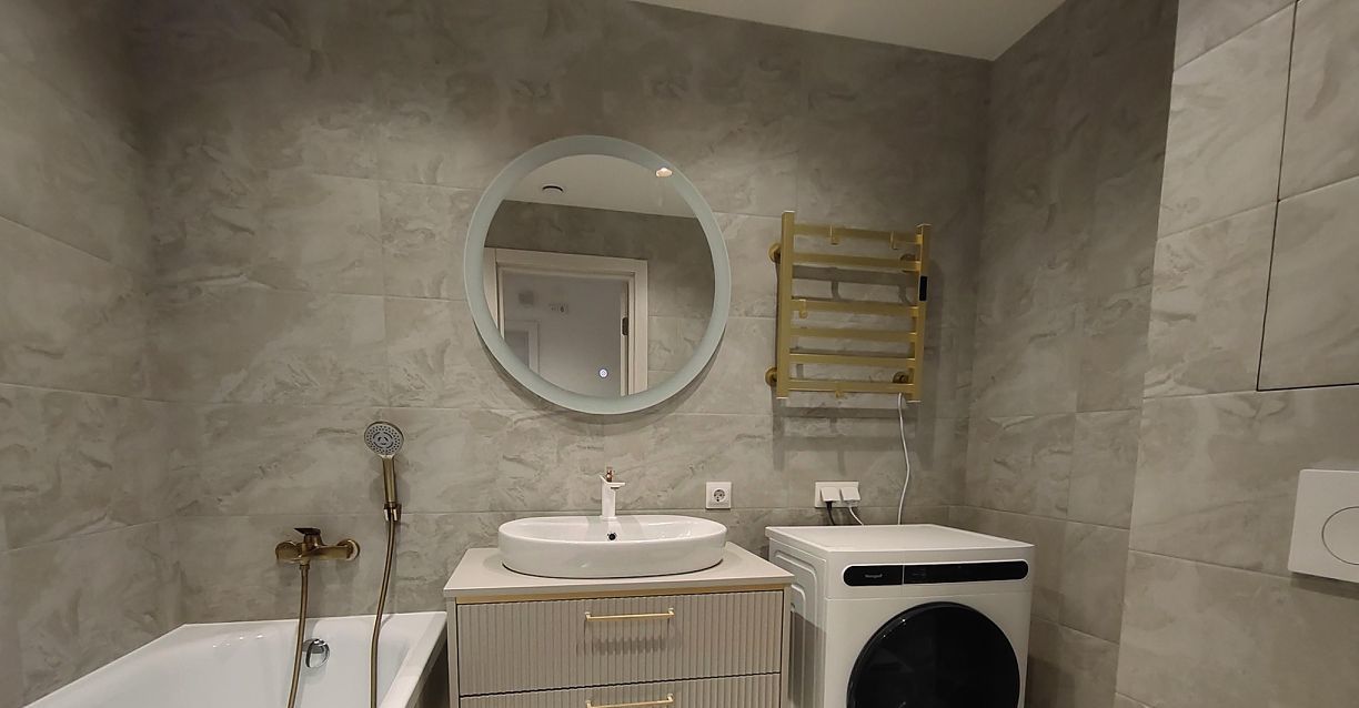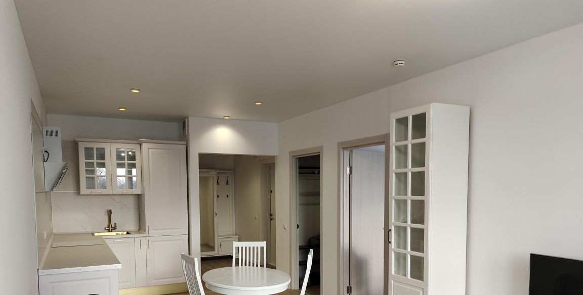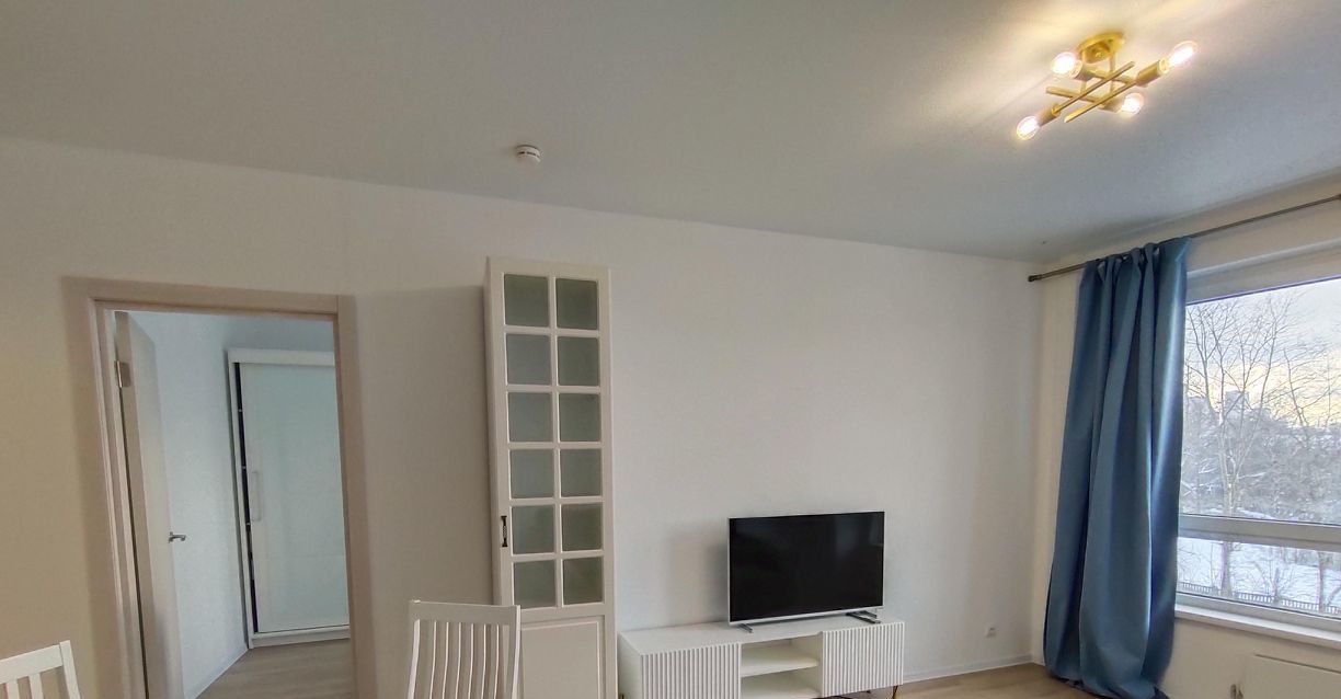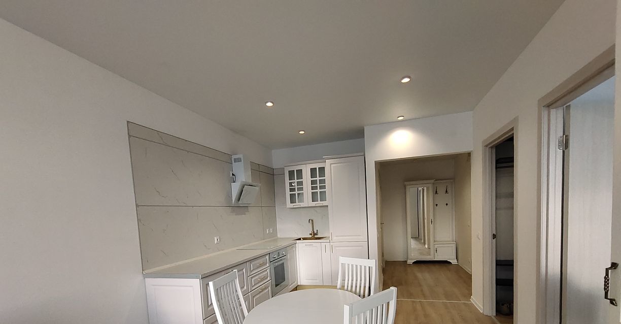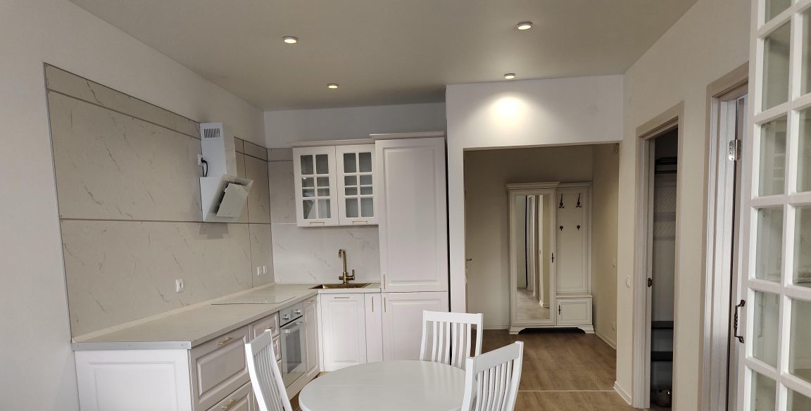 В основной комнате - раскладной двуспальный диван, смарт-телевизор, стол со стульями, шкаф, встроенная кухня с посудомоечной машиной и индукционной плитой, холодильник. Есть кондиционер, но сплит систему установят весной. Интернет подключат при заселении.