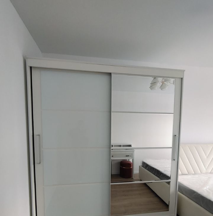 В спальне - двуспальная кровать, платяной шкаф с зеркалом.