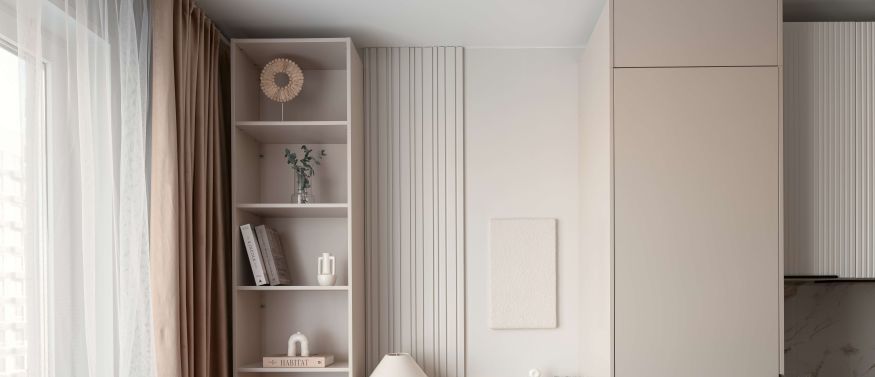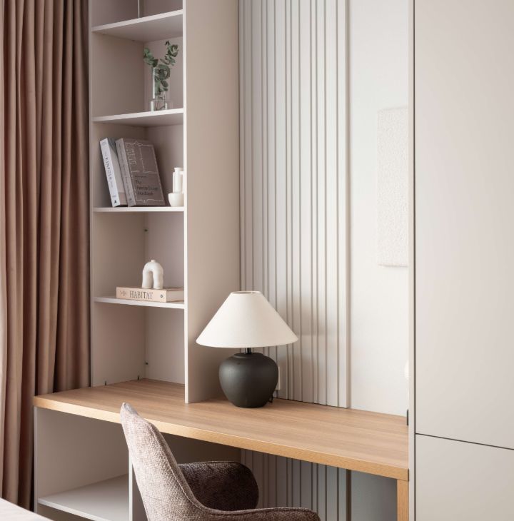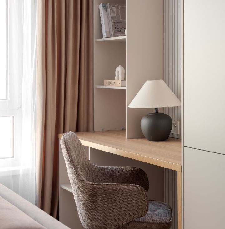 • Кабитет: Отдельная комната для работы или отдыха. Удобный диван, рабочий стол с креслом, стеллаж, комод, торшер. Можно использовать как полноценную гостевую спальню.