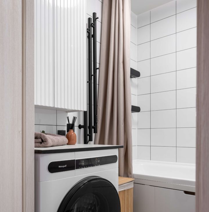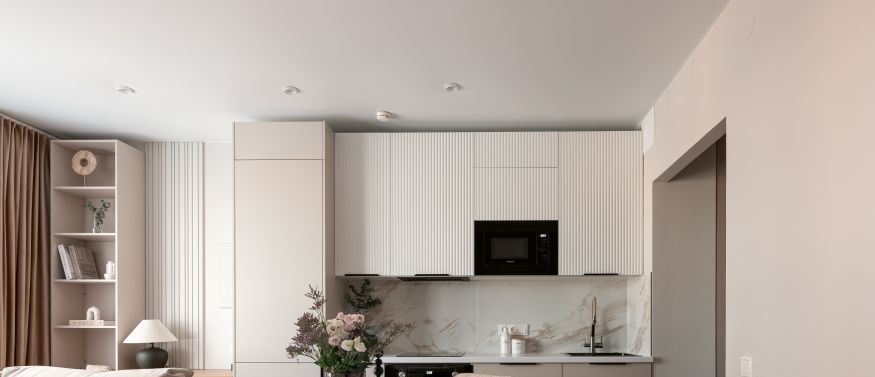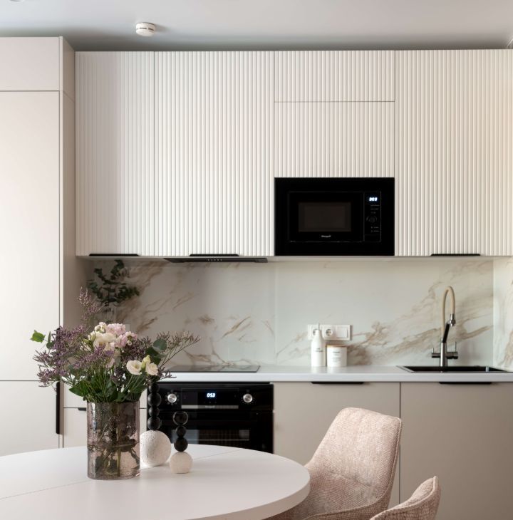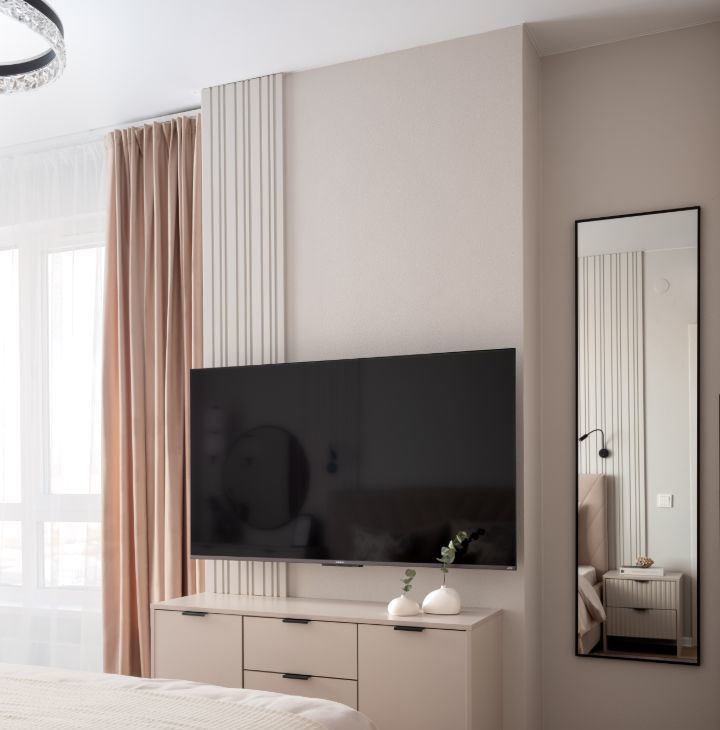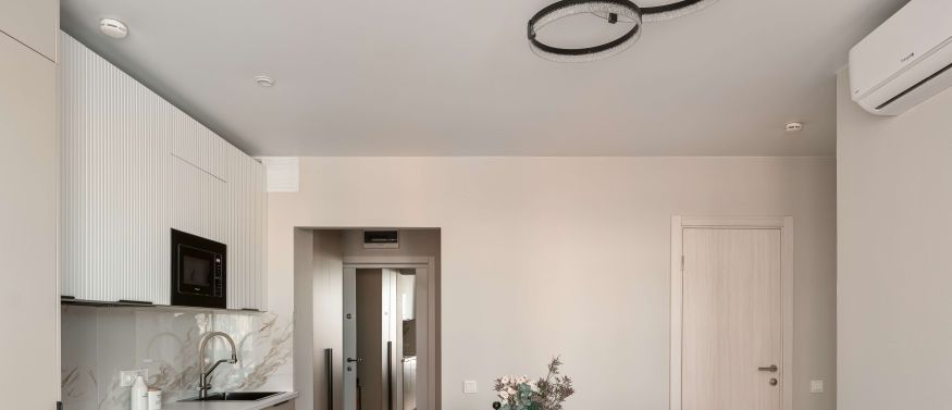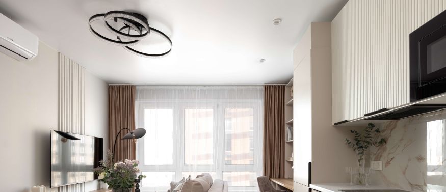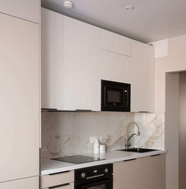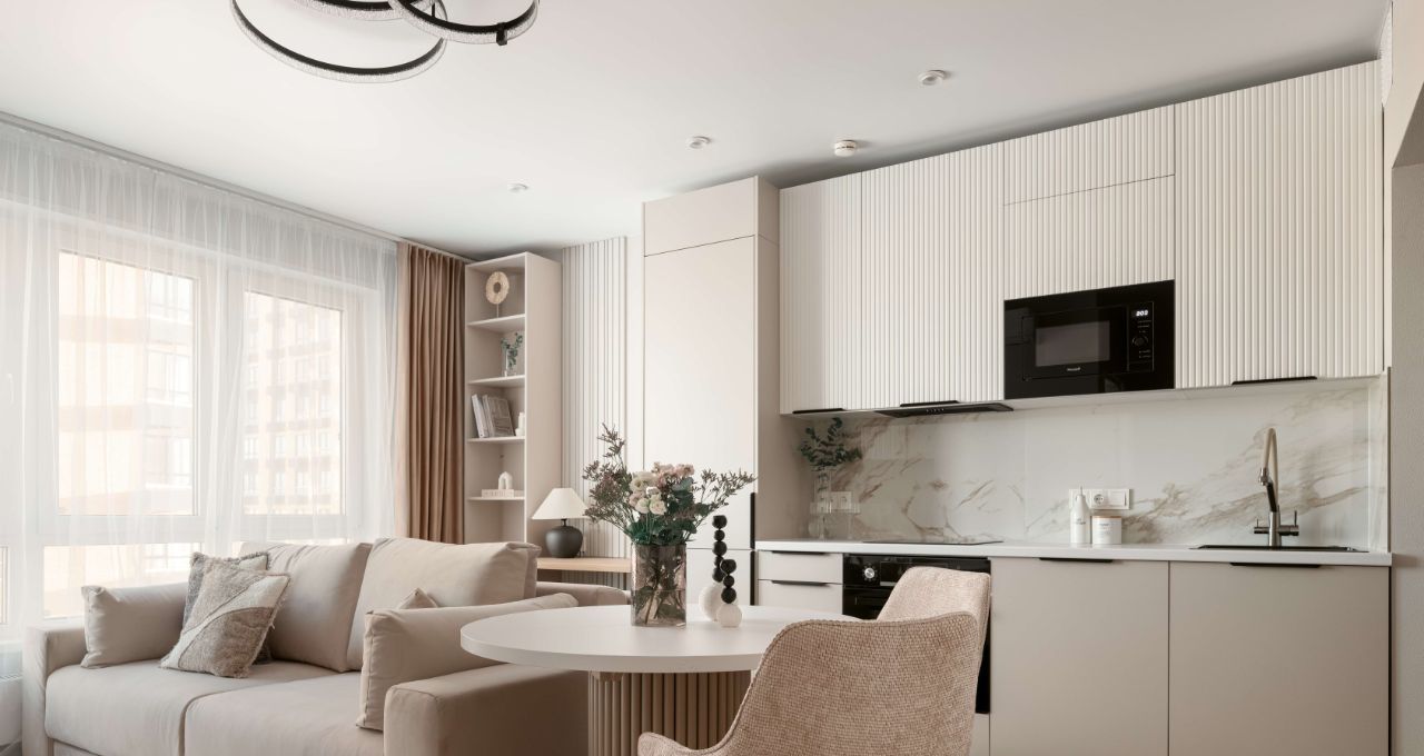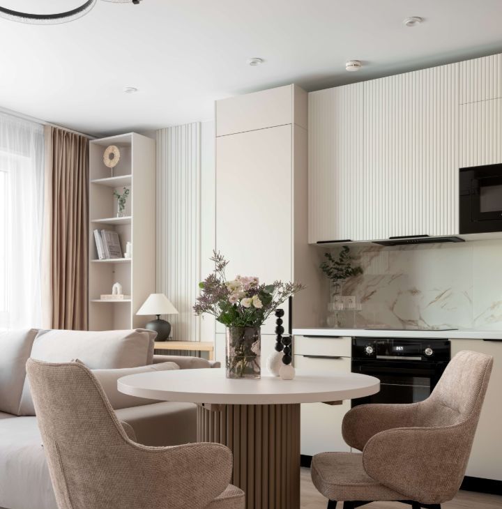 • Кухня-гостиная (студия): Современный гарнитур, встроенная техника премиум (холодильник Weissgauff NoFrost, посудомойка, индукционная панель, духовка с паром, вытяжка, микроволновая печь). Обеденная зона: раздвижной стол и 2 стильных поворотных стула. Мягкая зона: большой диван-кровать Босс Прайм (велюр) с ящиком для хранения. Телевизор Xiaomi 55 (для комфортного просмотра из любой зоны), два кондиционера.