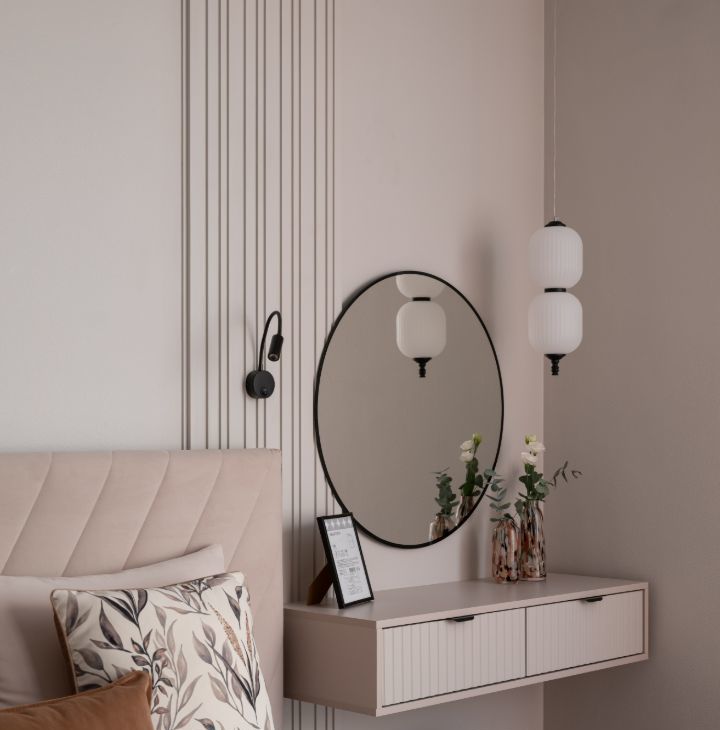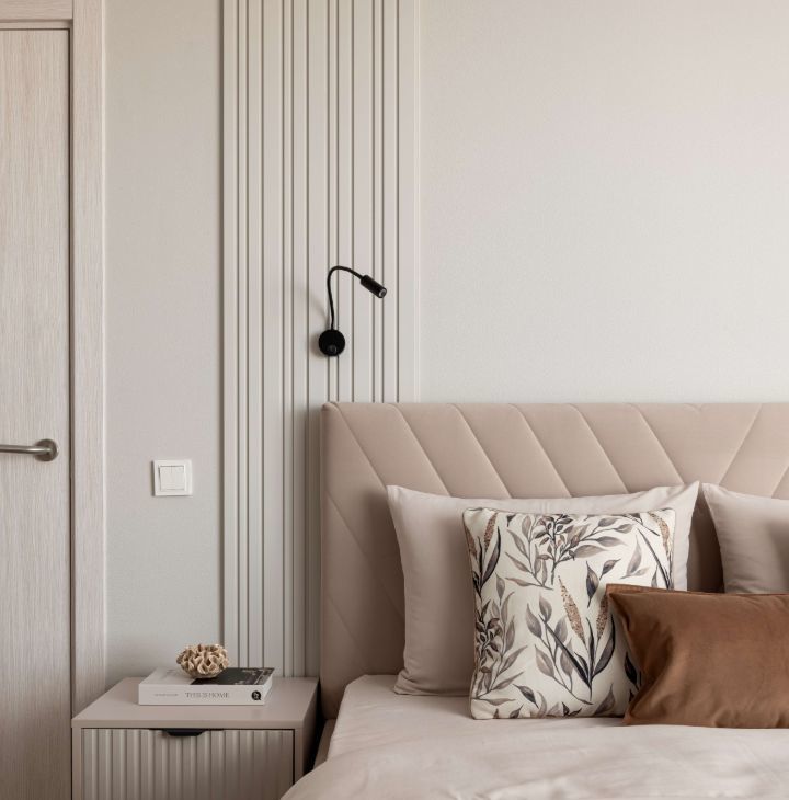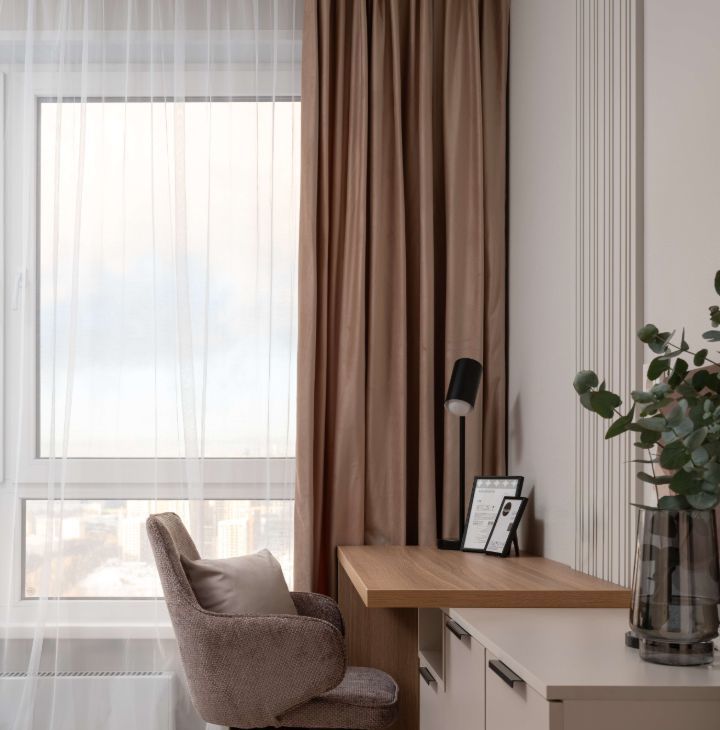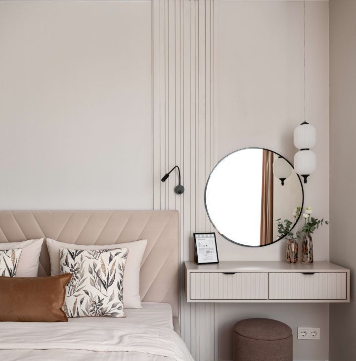 • Спальня: Уютная и функциональная. Кровать с подъёмным механизмом (Victori), ортопедический матрас COMFORT PLUS 200x160, вместительный шкаф, комод, пуф, кресло, зеркала. Продуманный текстиль (портьеры, тюль, постельное бельё, декоративные подушки).