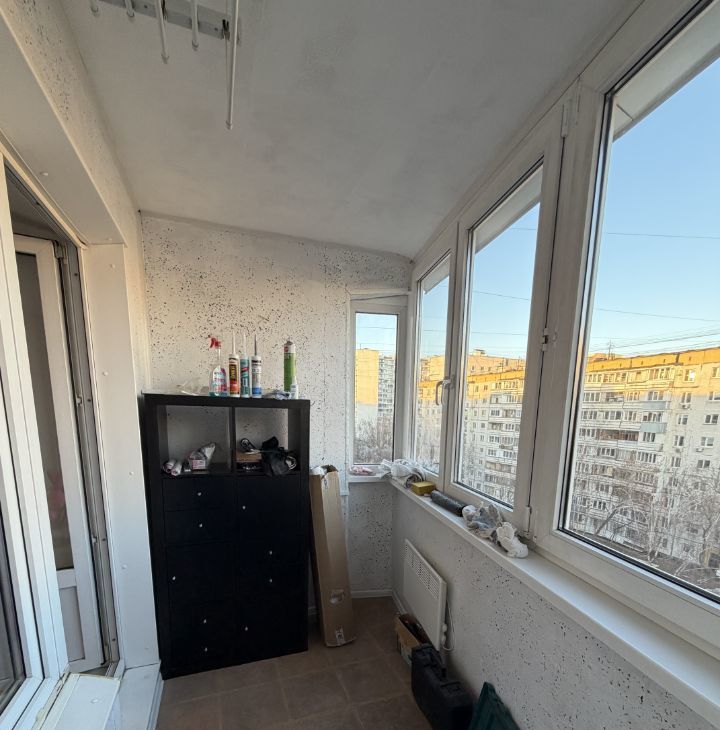 Застекленный балкон с видом на тихую улицу.