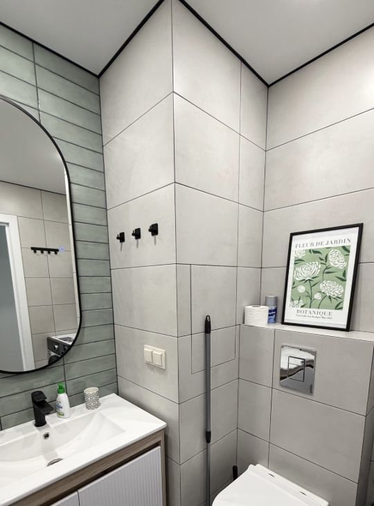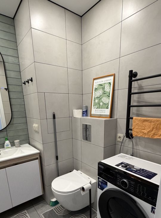 Санузел (ванная) с качественной сантехникой и стиральной машиной.