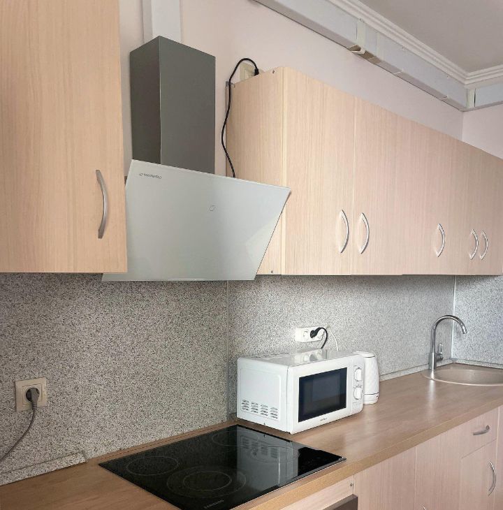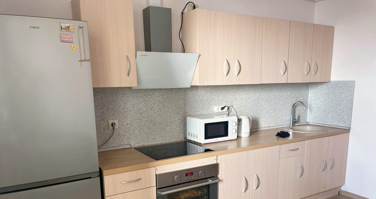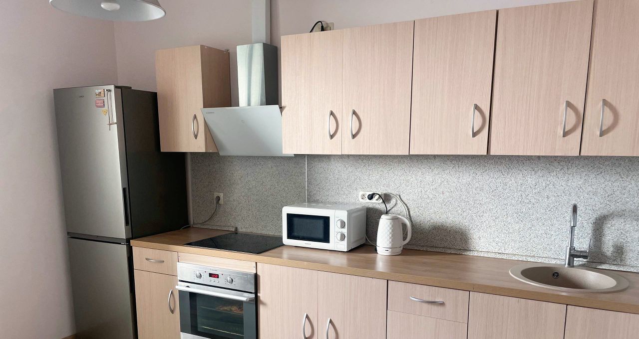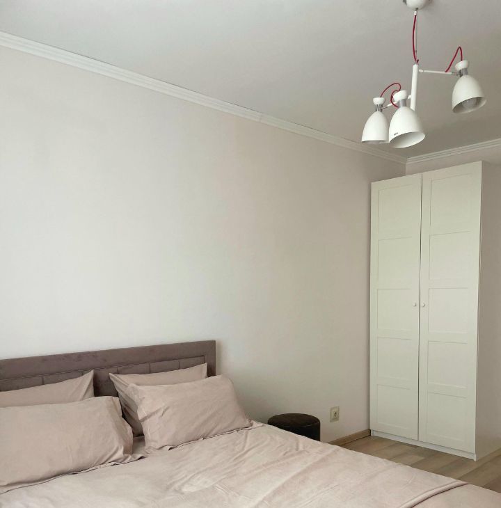 Кварита оборудована всем необходимым: холодильник, плита, микроволновая печь и стиральная машина. Из мебели — вместительные шкафы, удобный диван, двуспальная кровать. В гостиной установлен стильный шкаф и кресло.