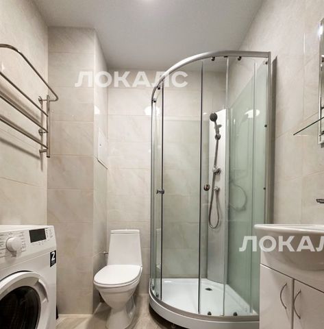 — Ванная: душевая кабина, стиральная машина, зеркало, раковина и комфортное освещение