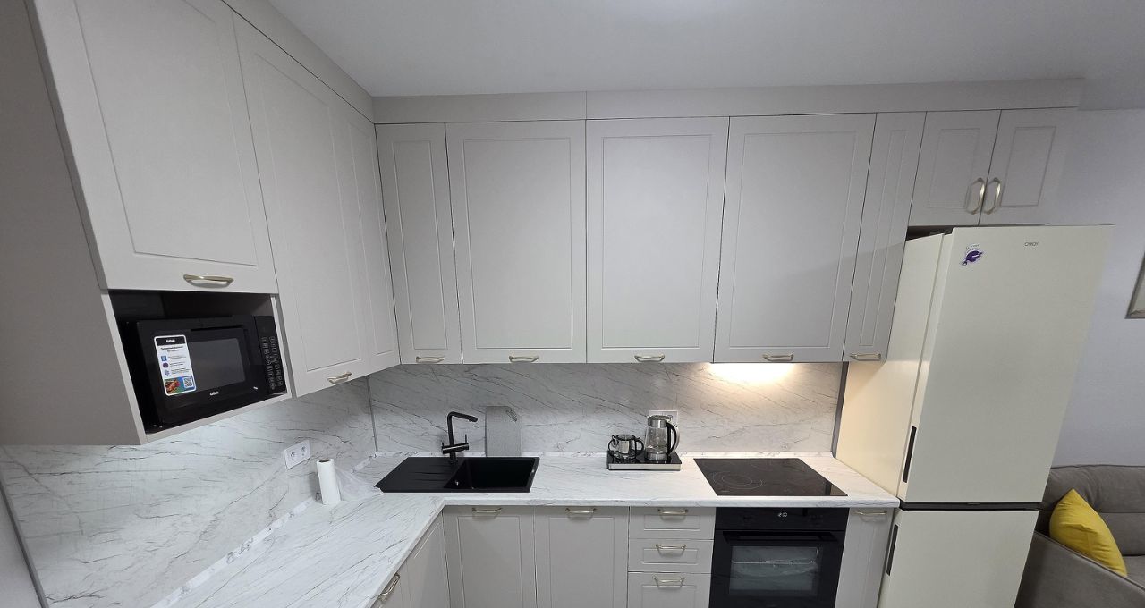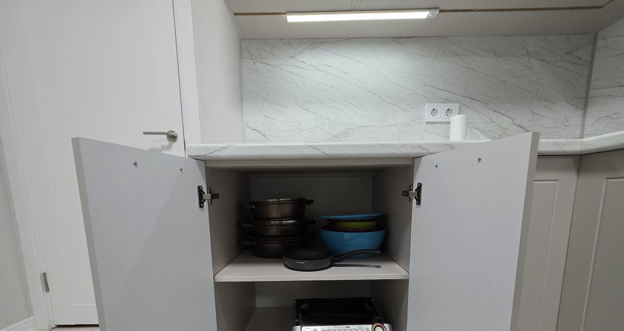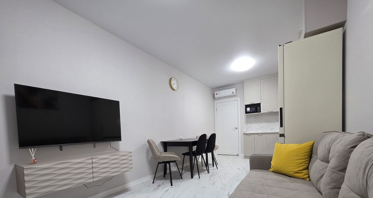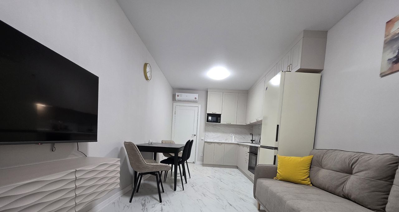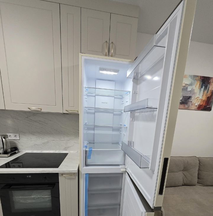 Полностью обставленная кухня - гостиная оснащена всей необходимой техникой: кондиционером, холодильником, телевизором, посудомоечной машиной, и остальной техникой для удобства. Установлен фильтр воды.
