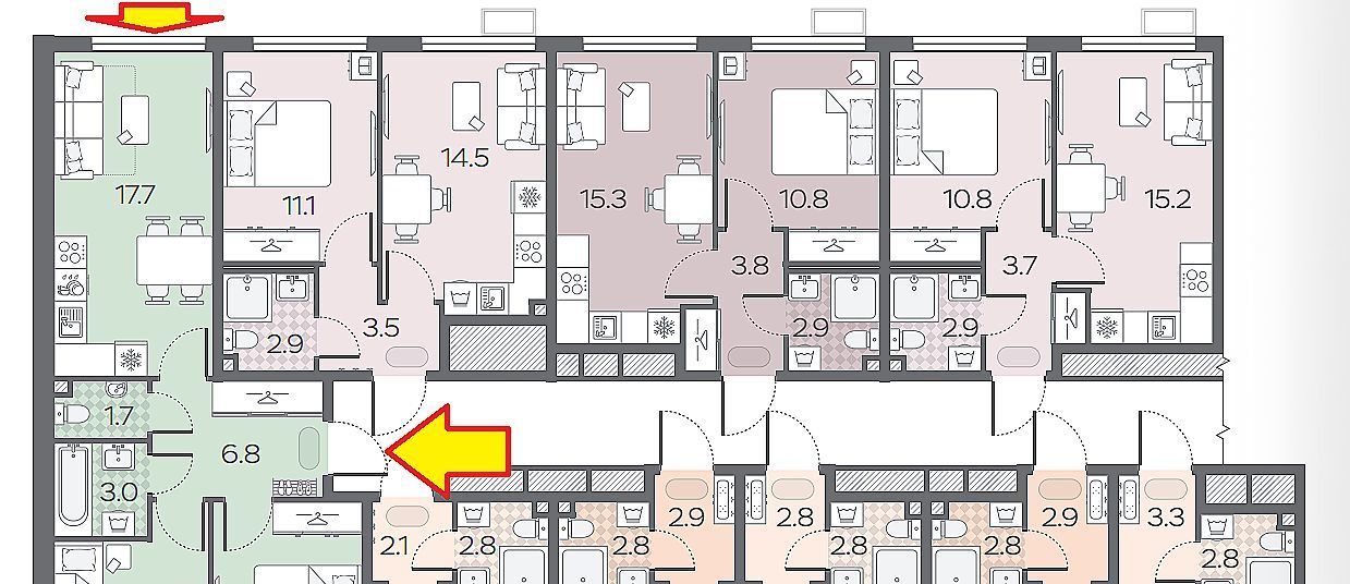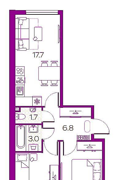 2-х комнатная КВАРТИРА распашного типа (ЕВРОТРЕШКА) с просторной кухней -гостиной (17,7 м2) и двумя изолированными комнатами.