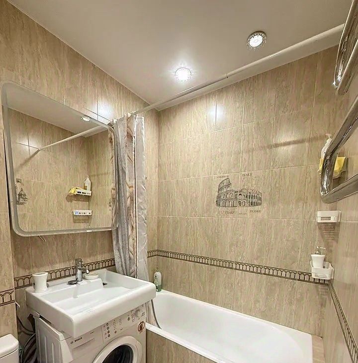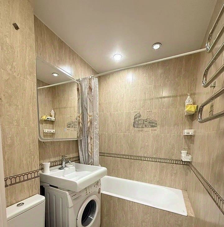 Совмещенный санузел оборудован ванной. Из техники представлены кондиционер, посудомоечная машина, телевизор, стиральная машина и холодильник. Также в квартире проведены интернет и телефон.