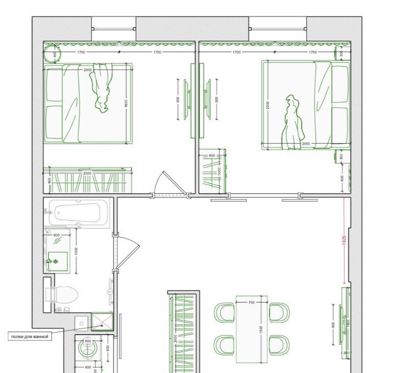 Удобное зонирование пространства, две уютные изолированные спальни и большая кухня-гостиная.