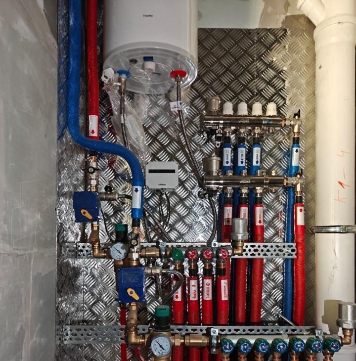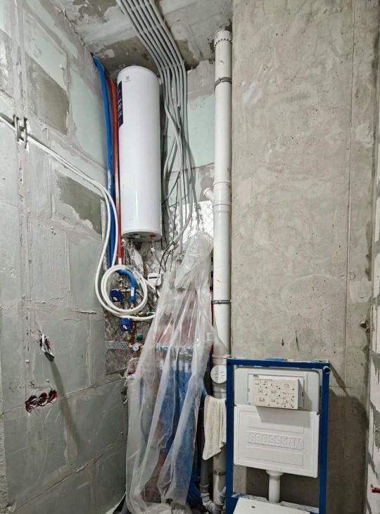 Сделана сантехника, коллектор, датчики давления, защита от протечек, водонагреватель, установлена инсталяция и унитаз.