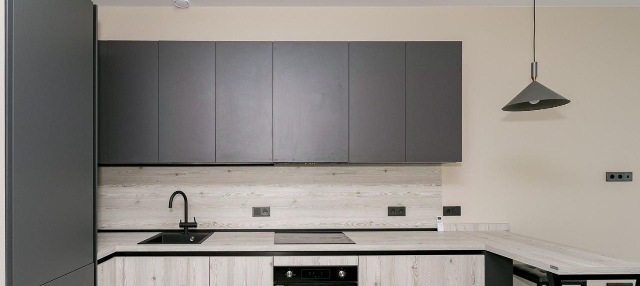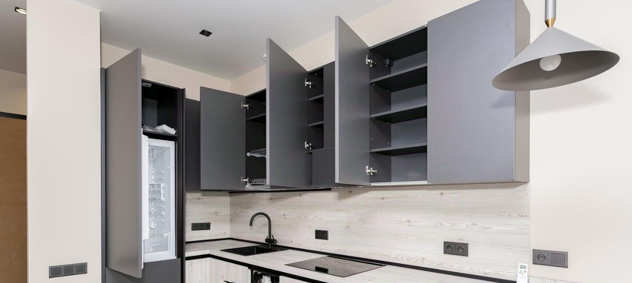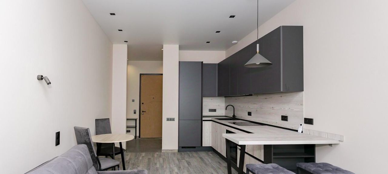 В кухне-гостиной установлен кухонный гарнитур с огромным количеством пространств для хранения, с холодильником, посудомоечной машиной и мини барной стойкой, столиком со стульями и большим раскладным ортопедическим диваном, телевизором, кондиционером.