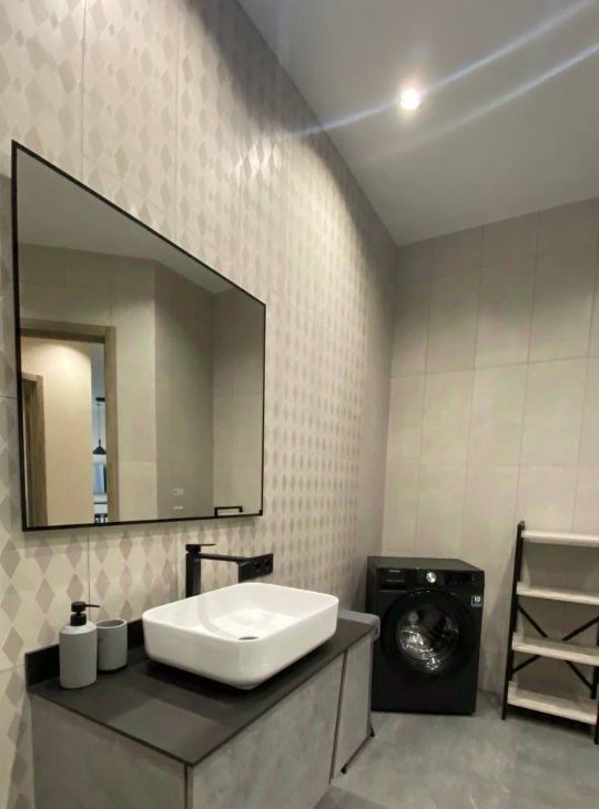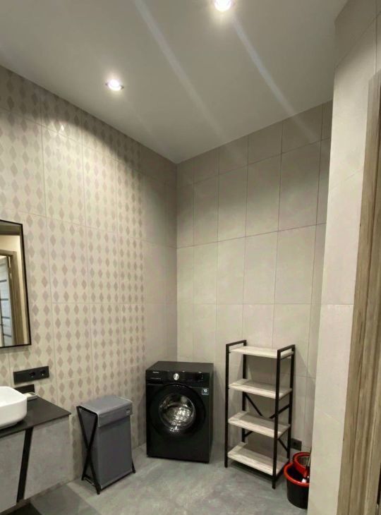В санузле установлена душевая кабинета, санитарный душ, раковина и зеркало с подсветкой, установлена стиральная машина.