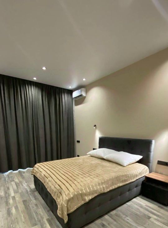 В спальной комнате оборудована большая гардеробная, в самой спальной комнате широкая кровать с ортопедическим матрацем, прикроватными тумбами, кондиционером.