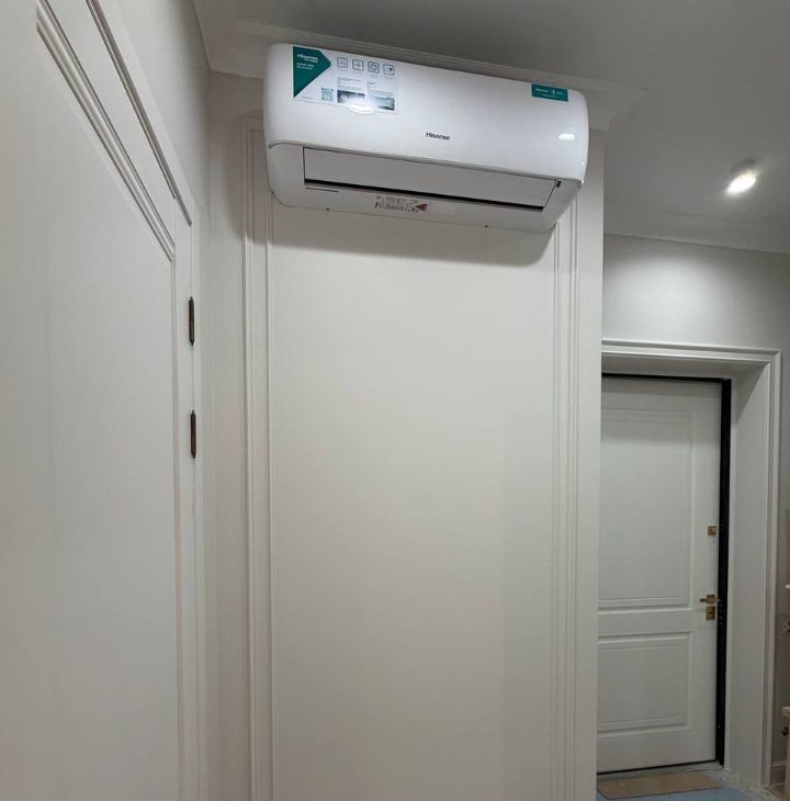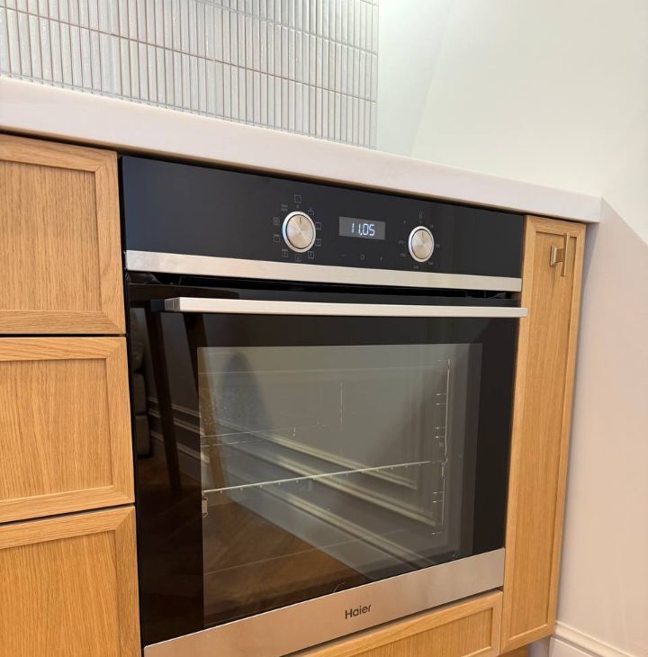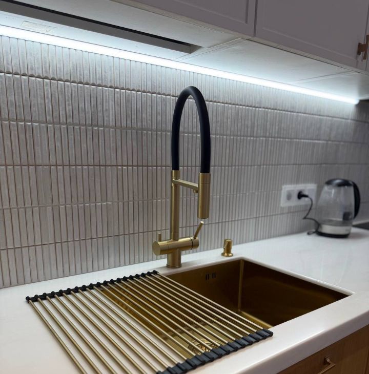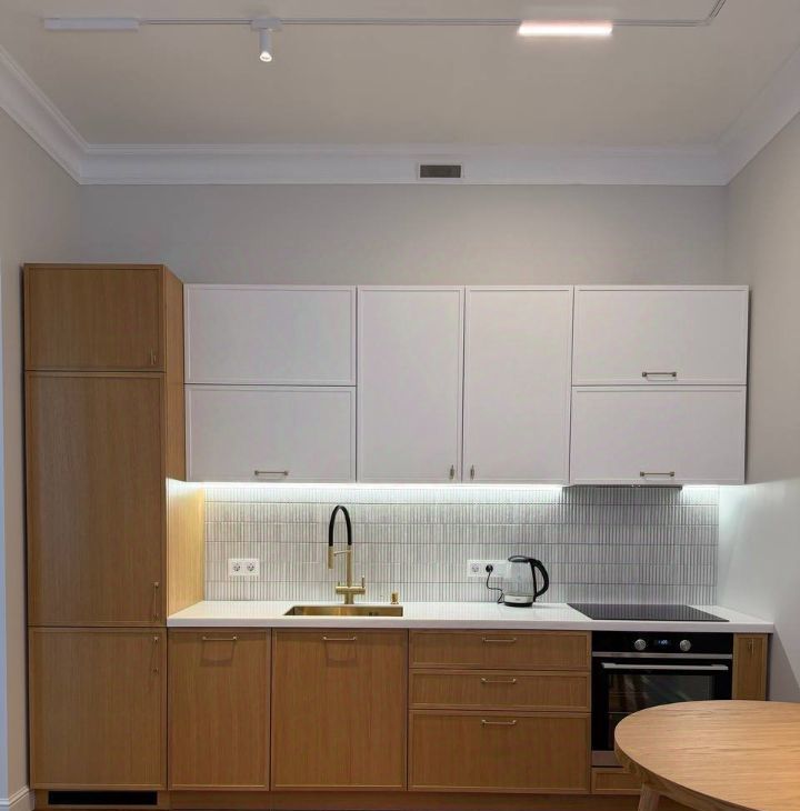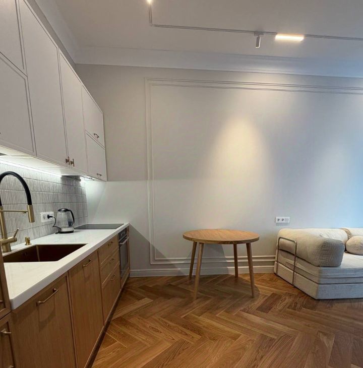 Современное планировочное решение. Кухня-гостиная 23 кв.м. и изолированная спальня. Новая современная мебель и техника. Стильный кухонный гарнитур со встроенной бытовой техникой (духовой шкаф, индукционная варочная панель, посудомоечная машина фирмы Haier). Вместительный холодильник. Установлены стиральная и сушильные машины.