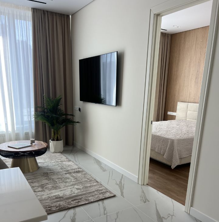 Планировка: просторная гостиная с кухонной зоной, изолированная спальня, санузел, гардеробная.