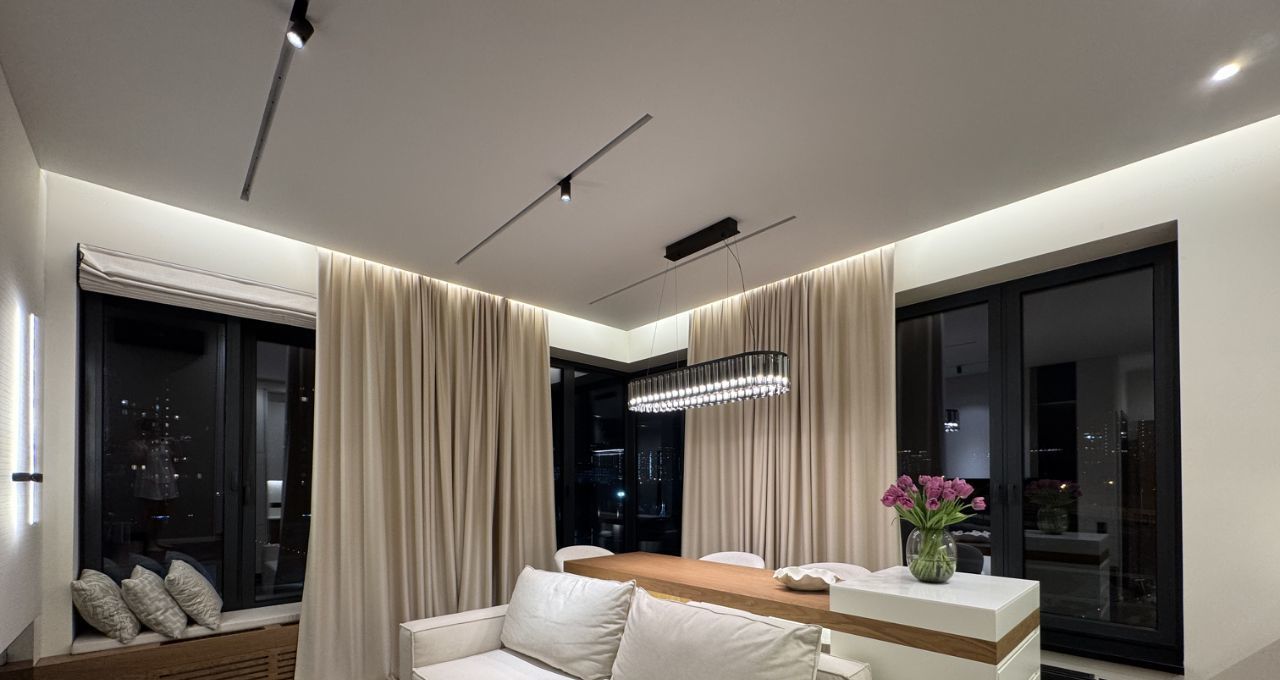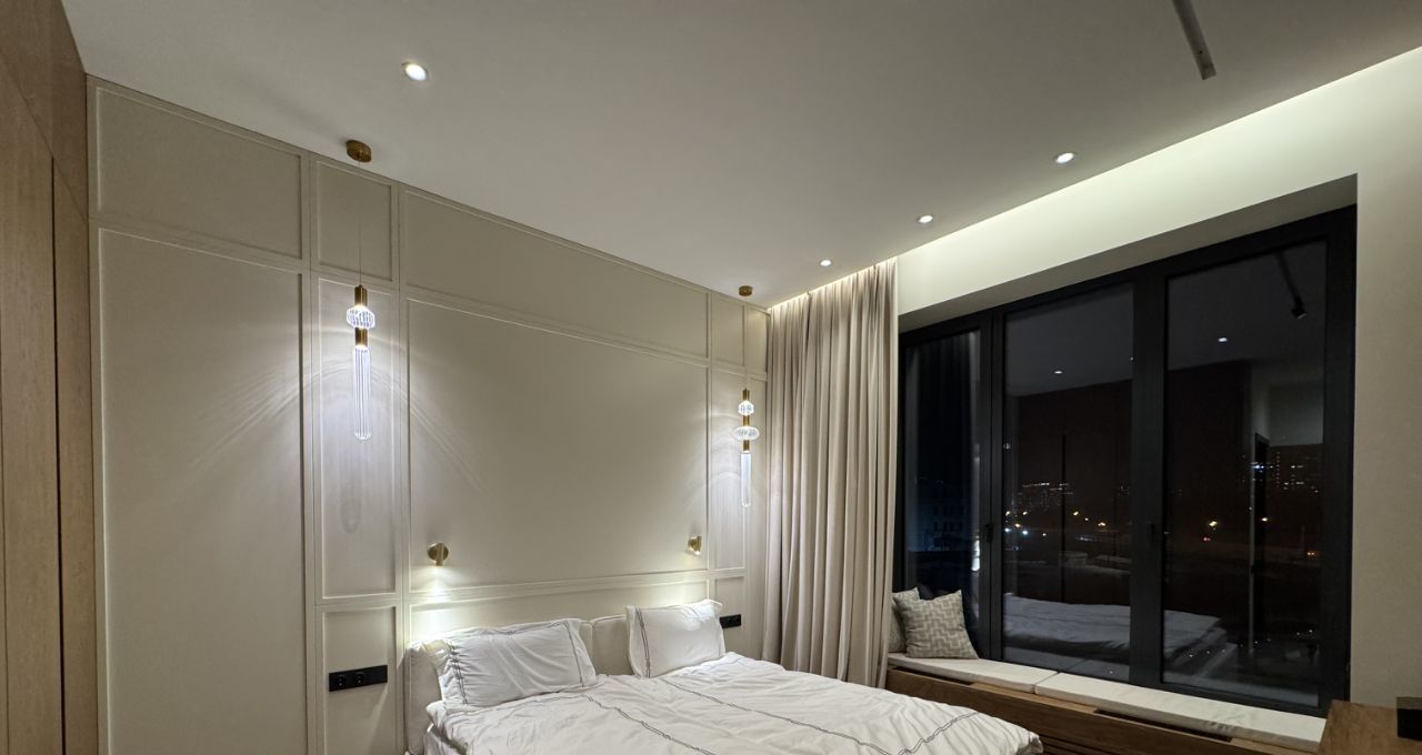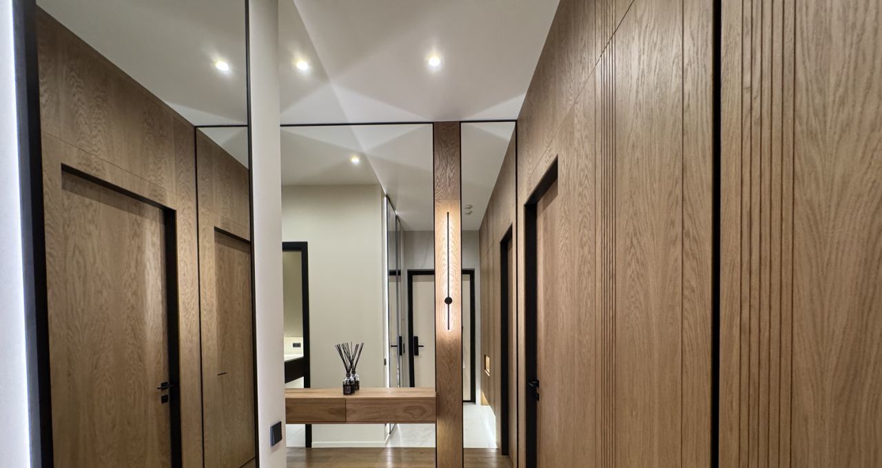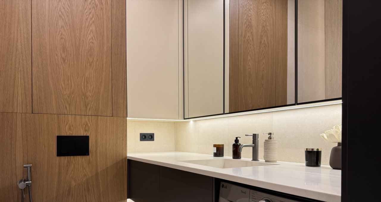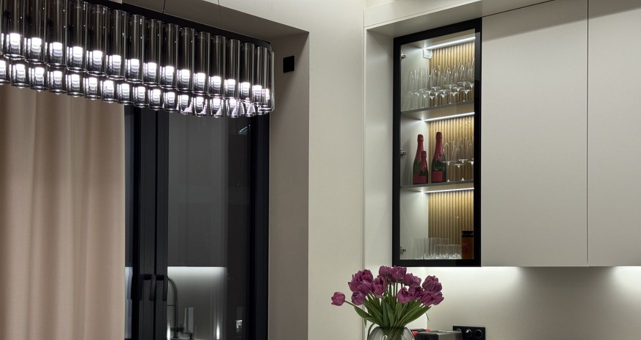 Датчики протечки, кондер в каждой комнате, подогрев полов, электронный замок, продуманная подсветка, организация подоконников для комфортного времяпрепровождения, водяной камин (безопасен для детей, работает как увлажнитель), много дизайнерских панелей.