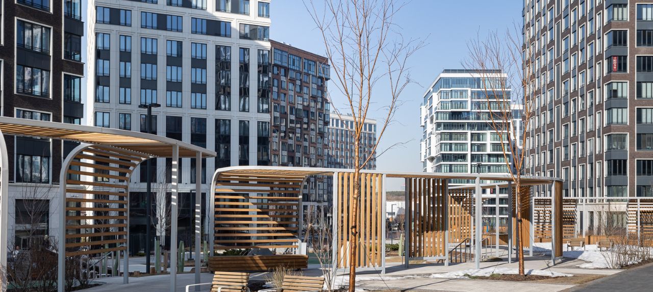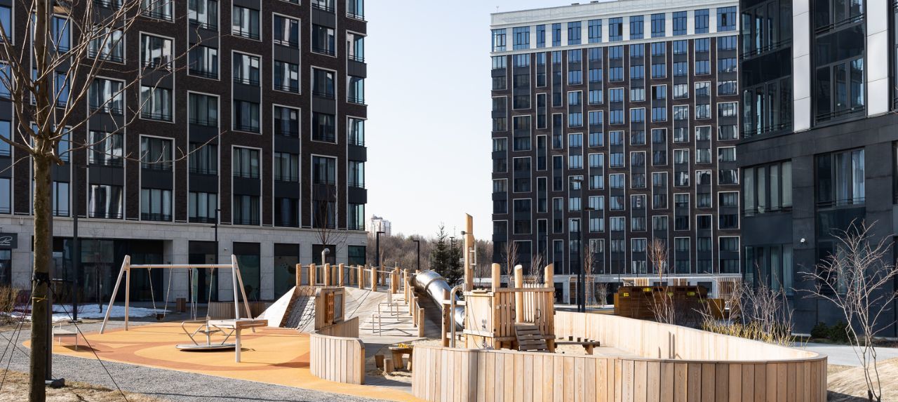 Территория ЖК: большой парк 16 га с зонами отдыха, детскими и спортивными площадками и набережной.