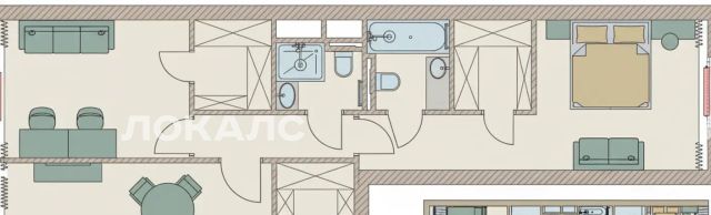 Приватная зона отграничена от общей и оборудована двумя санузлами (с ванной в спальне и душевой рядом со второй комнатой), а также гардеробными в каждой комнате