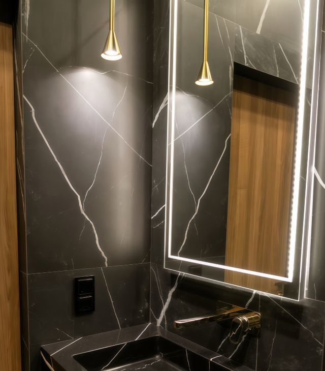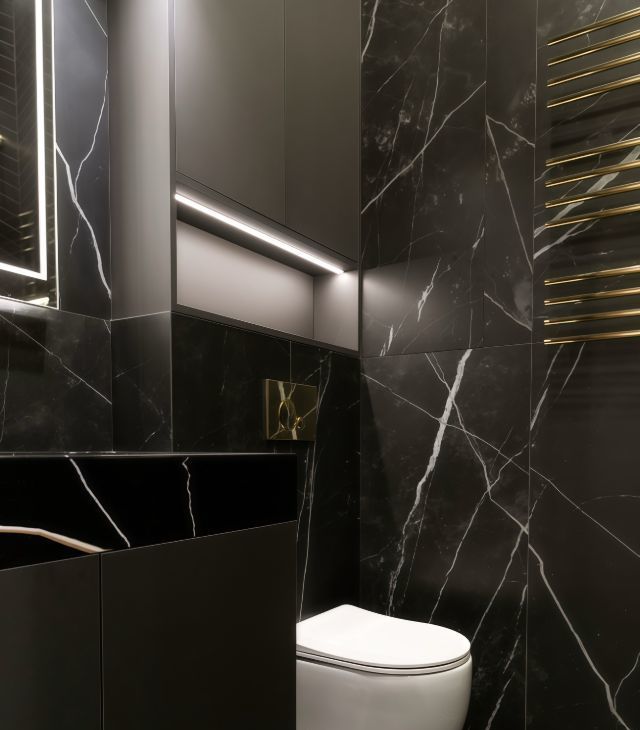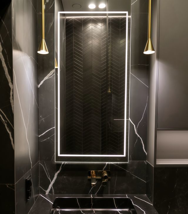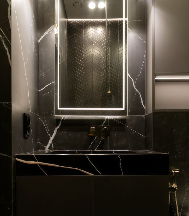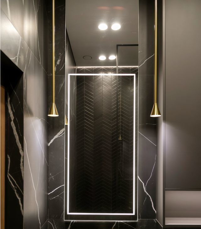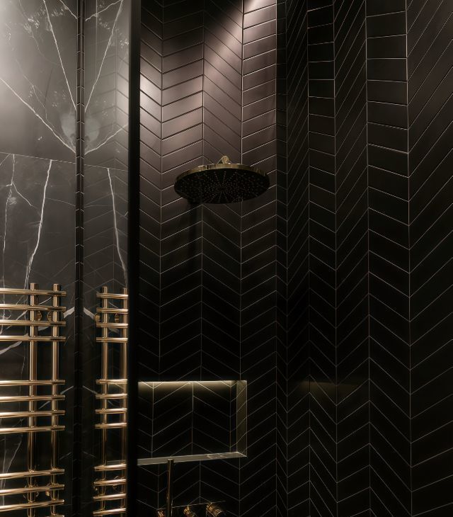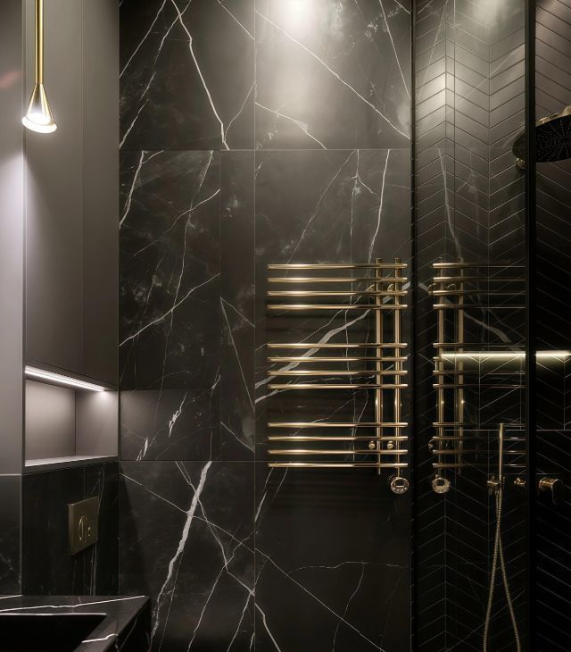 Просторная ванная комната оборудована душевой кабиной. Особенности планировки и тщательно подобранные элементы интерьера и материалы, создают атмосферу стиля и комфорта.