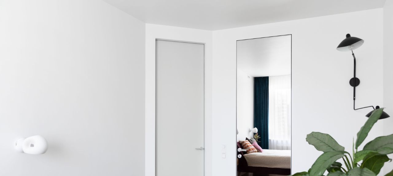 2ух комнатная квартира студия в доме бизнес-класса. 1 спальня, гардеробная, кладовая, совмещенный санузел. Панорамные окна. Окно спальни выходит во двор. Потолок 2.90. Межкомнатные двери высотой 2.70 (2 из 4 зеркальные с обоих сторон).