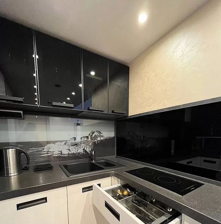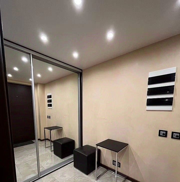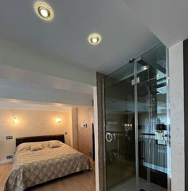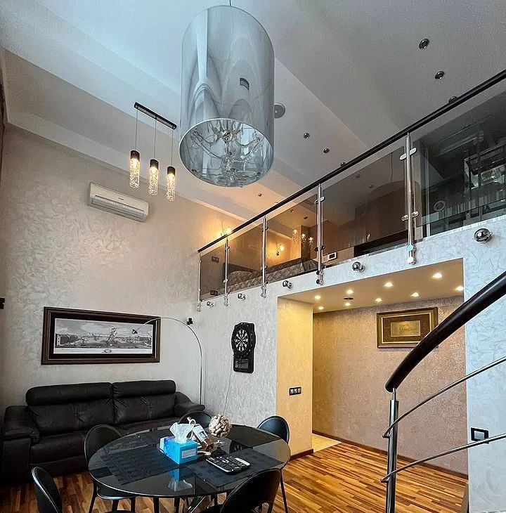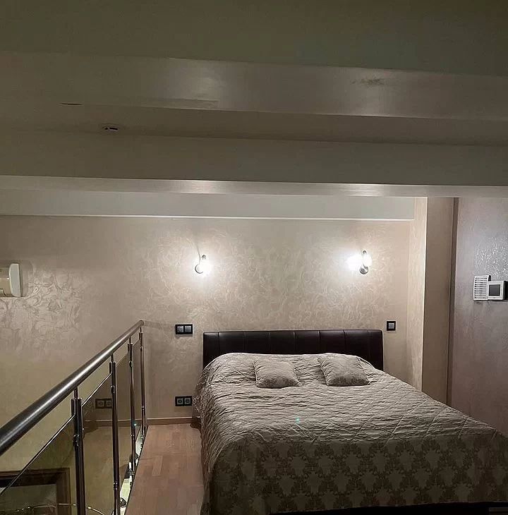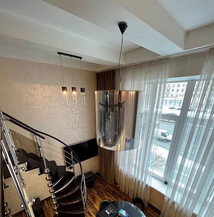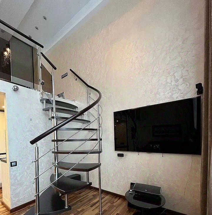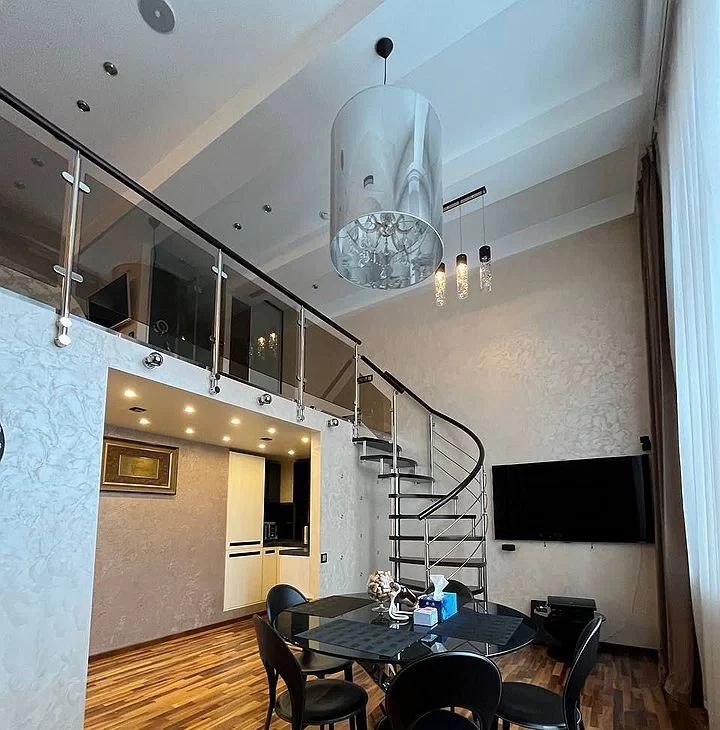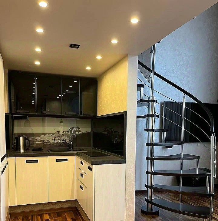 Студия: Прихожая, укомплектованная пространством для хранения (шкаф, стеллажи, гладильная доска, утюг), зона ожидания, совмещённый санузел (душ. кабина, раковина), ванная комната укомплектована мебелью и техникой - стиральная машина. Встроенная кухня, высокий вместительный холодильник с морозильной камерой, варочная панель, встроенная посудомоечная машина, микроволновая печь, электрочайник Воrk. Кухня полностью укомплектована системой хранения для посуды, бокалов и бытовых принадлежностей. Гостиная с просторным диваном, круглым столом на 5 человек, плазменным телевизором, электронной игрой дартс и зоной отдыха, панорамные окна под потолок (до второго этажа). Стильная винтовая лестница на второй этаж.