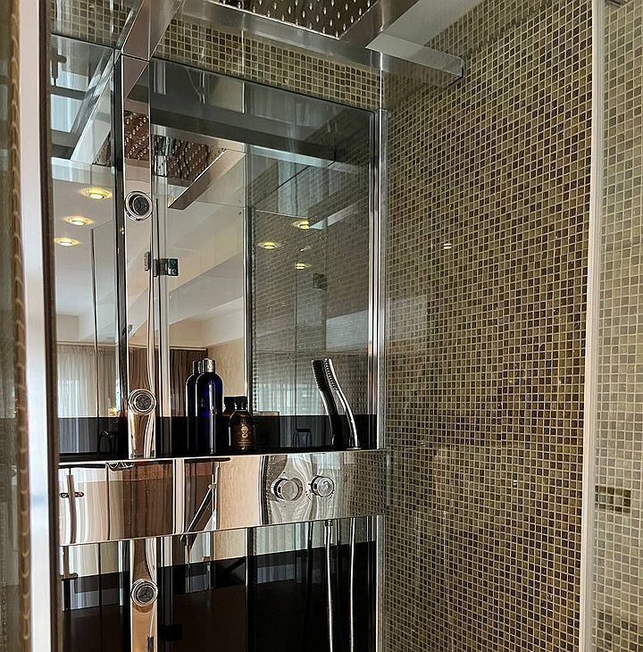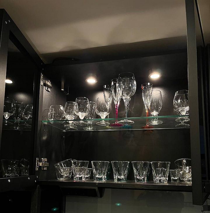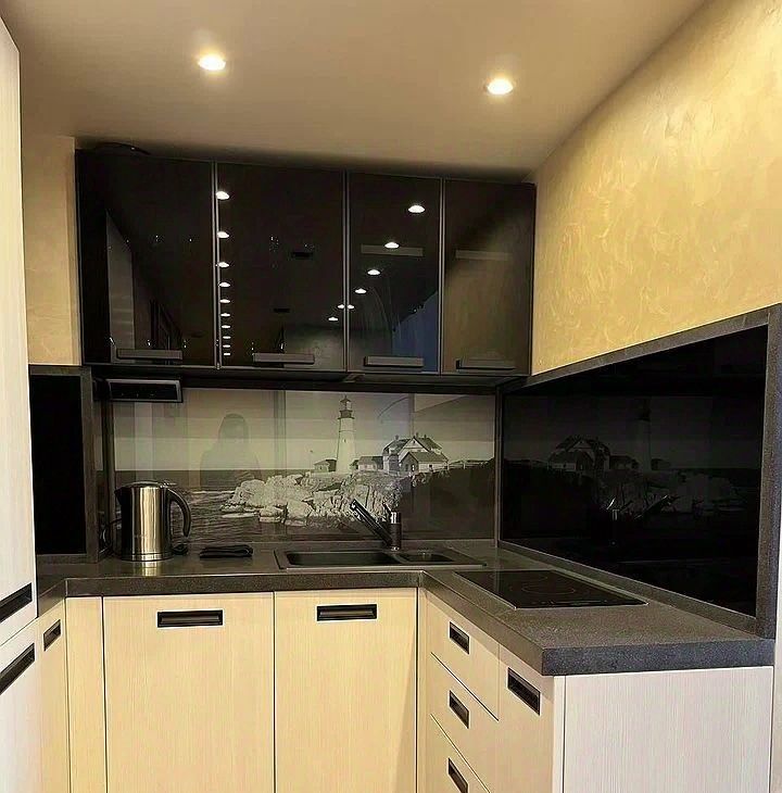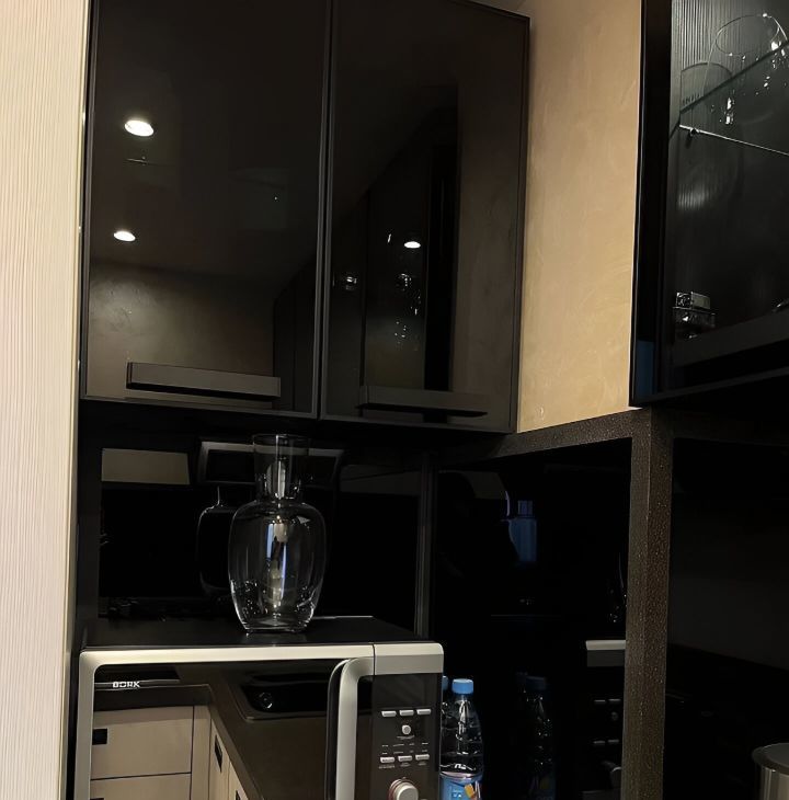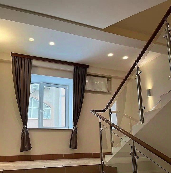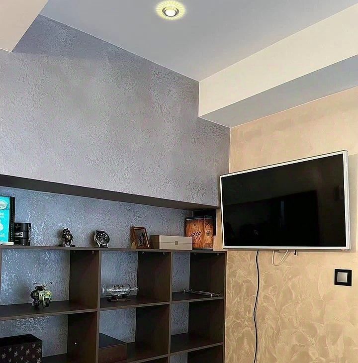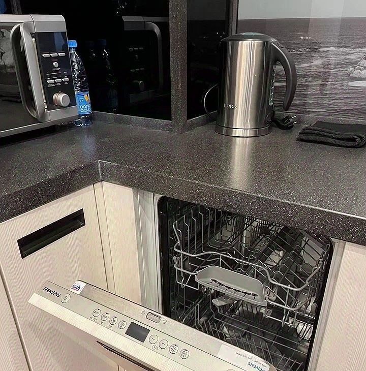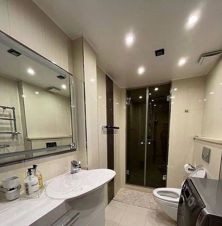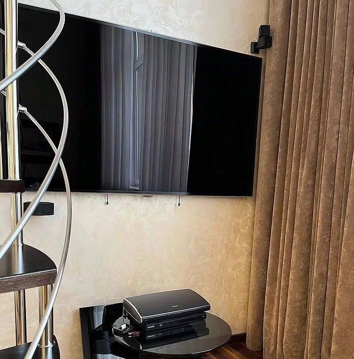 Студия: Прихожая, укомплектованная пространством для хранения (шкаф, стеллажи, гладильная доска, утюг), зона ожидания, совмещённый санузел (душ. кабина, раковина), ванная комната укомплектована мебелью и техникой - стиральная машина. Встроенная кухня, высокий вместительный холодильник с морозильной камерой, варочная панель, встроенная посудомоечная машина, микроволновая печь, электрочайник Воrk. Кухня полностью укомплектована системой хранения для посуды, бокалов и бытовых принадлежностей. Гостиная с просторным диваном, круглым столом на 5 человек, плазменным телевизором, электронной игрой дартс и зоной отдыха, панорамные окна под потолок (до второго этажа). Стильная винтовая лестница на второй этаж.