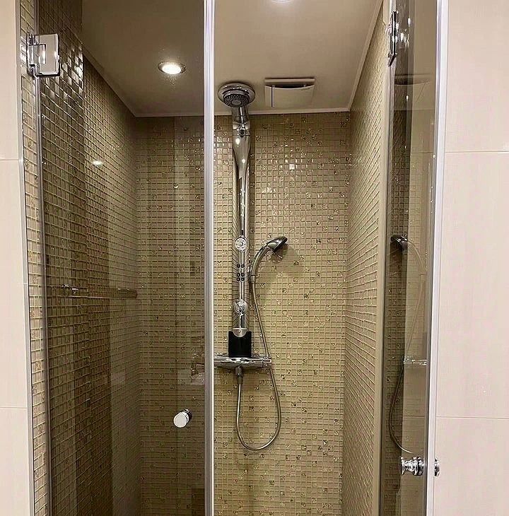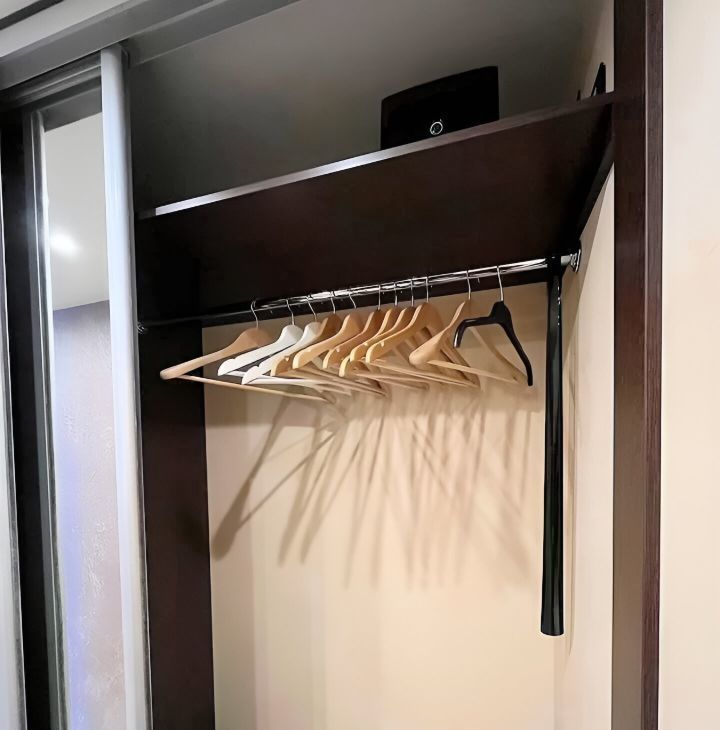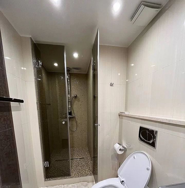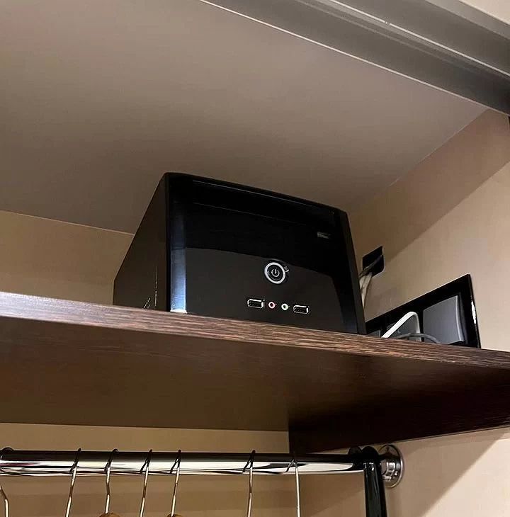 Спальная зона с плазменным телевизором и небольшой зоной хранения для вещей и книг, душевая кабина и мини-гардеробная.