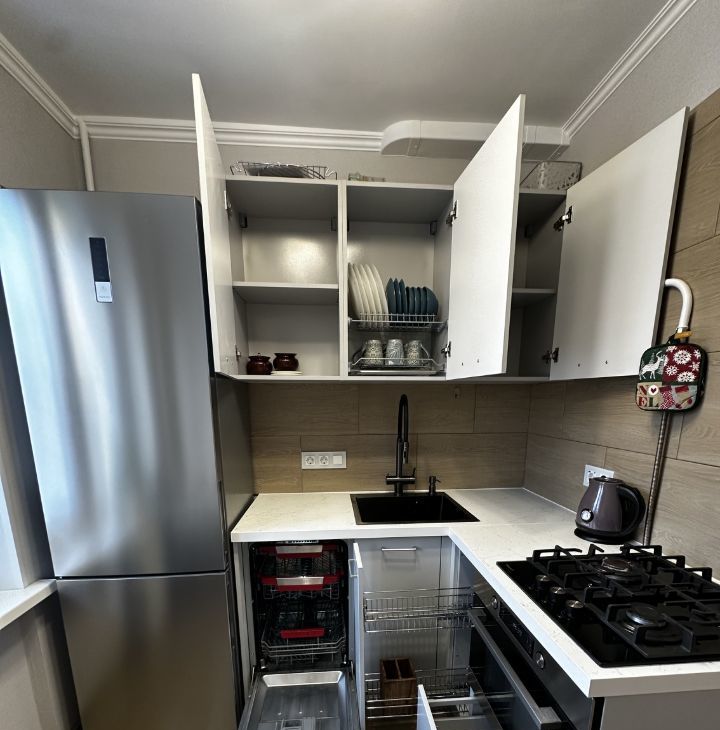 Квартира полностью оснащена всем необходимым для комфортного проживания: мебелью и техникой (холодильник, стиральная машина с сушкой, посудомоечная машина, плита, духовка+СВЧ, телевизоры, кондиционер). Квартира оснащена хорошей шумоизоляцией. Летом в квартире прохладно, зимой тепло.