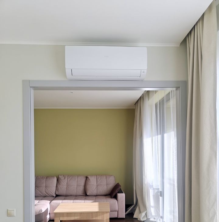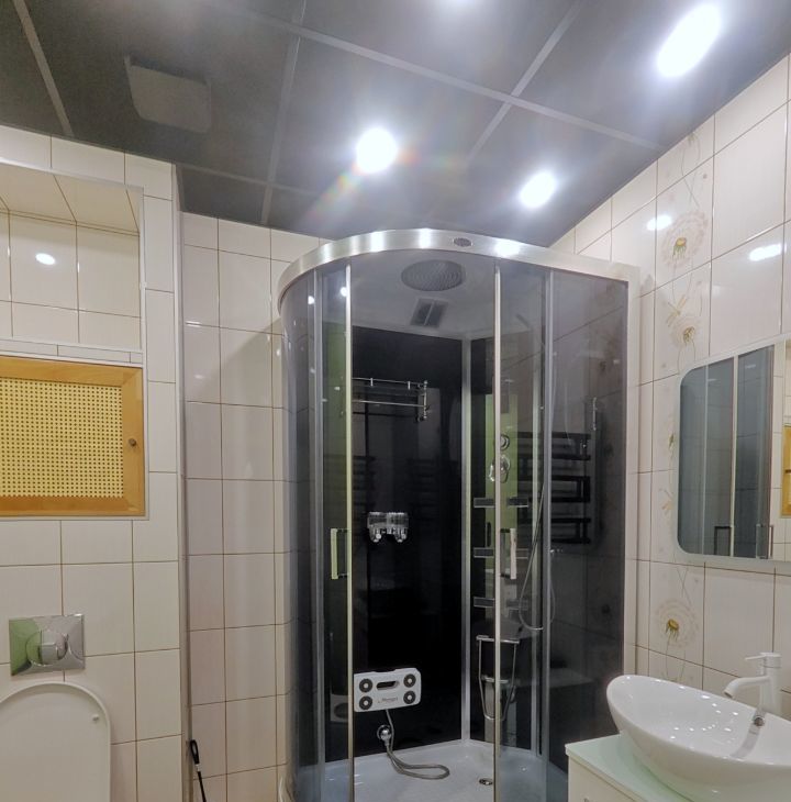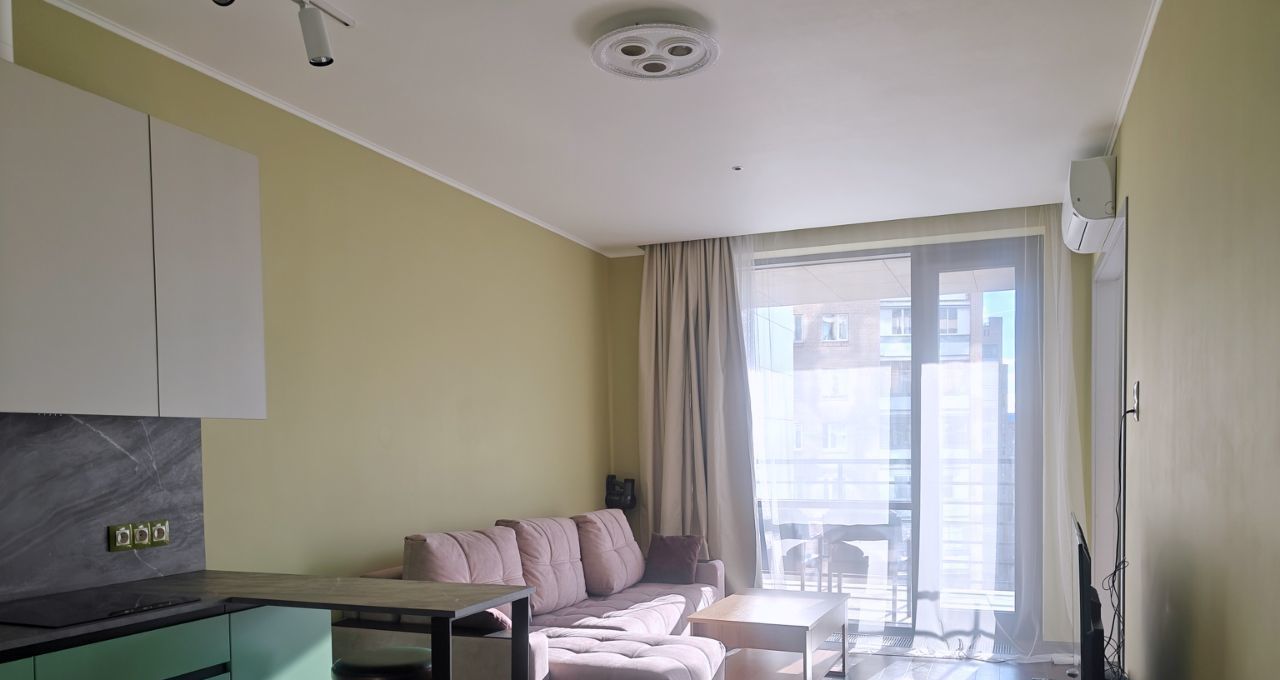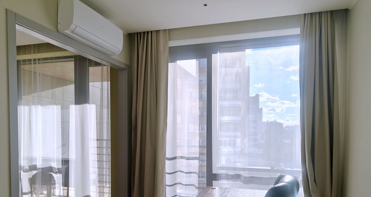 Окна выходят на юг, есть просторный балкон-терраса. В каждой комнате установлен кондиционер. В спальне большая двуспальная кровать, вместительный шкаф-купе, рабочее место. В кухне-гостиной большой диван "евро-книжка", телевизор с внешней антенной. Кухня укомплектована всей необходимой техникой: электрическая варочная панель, духовой шкаф, посудомоечная машина, холодильник, микроволновая печь. Вместительная гардеробная комната с продуманной системой хранения. Санузел с теплым полом оборудован душевой кабиной, гигиеническим душем, зеркалом с подсветкой, вместительной стиральной машиной.
