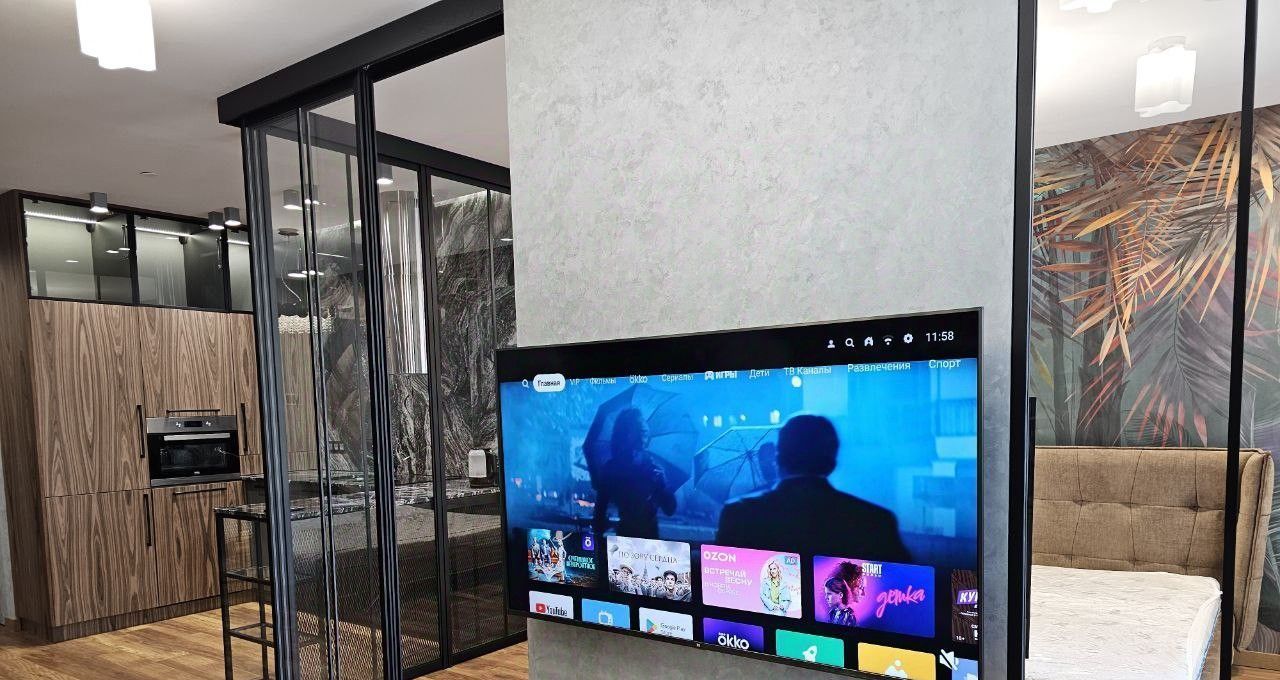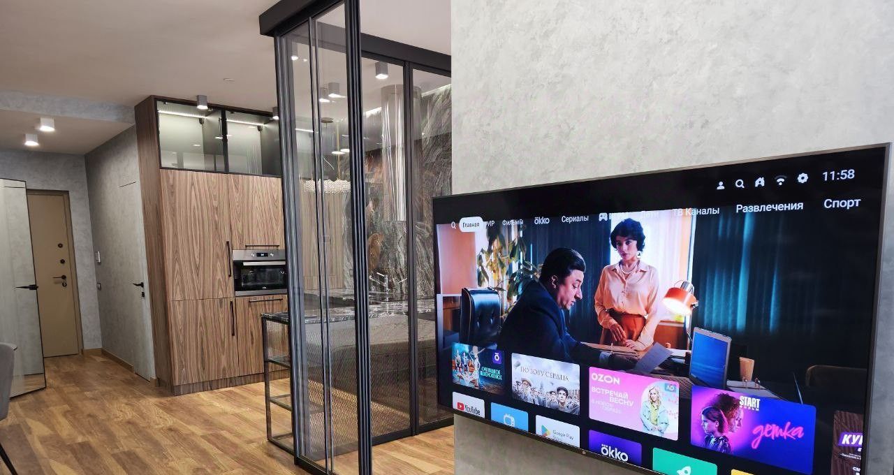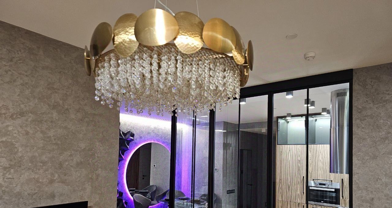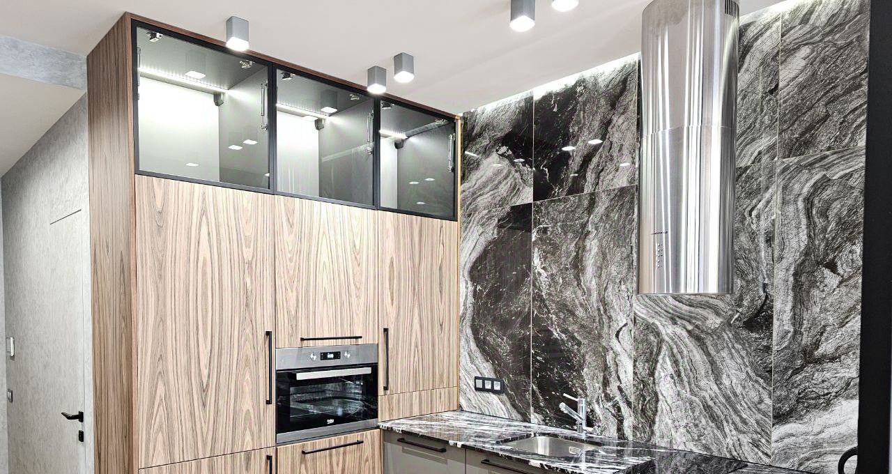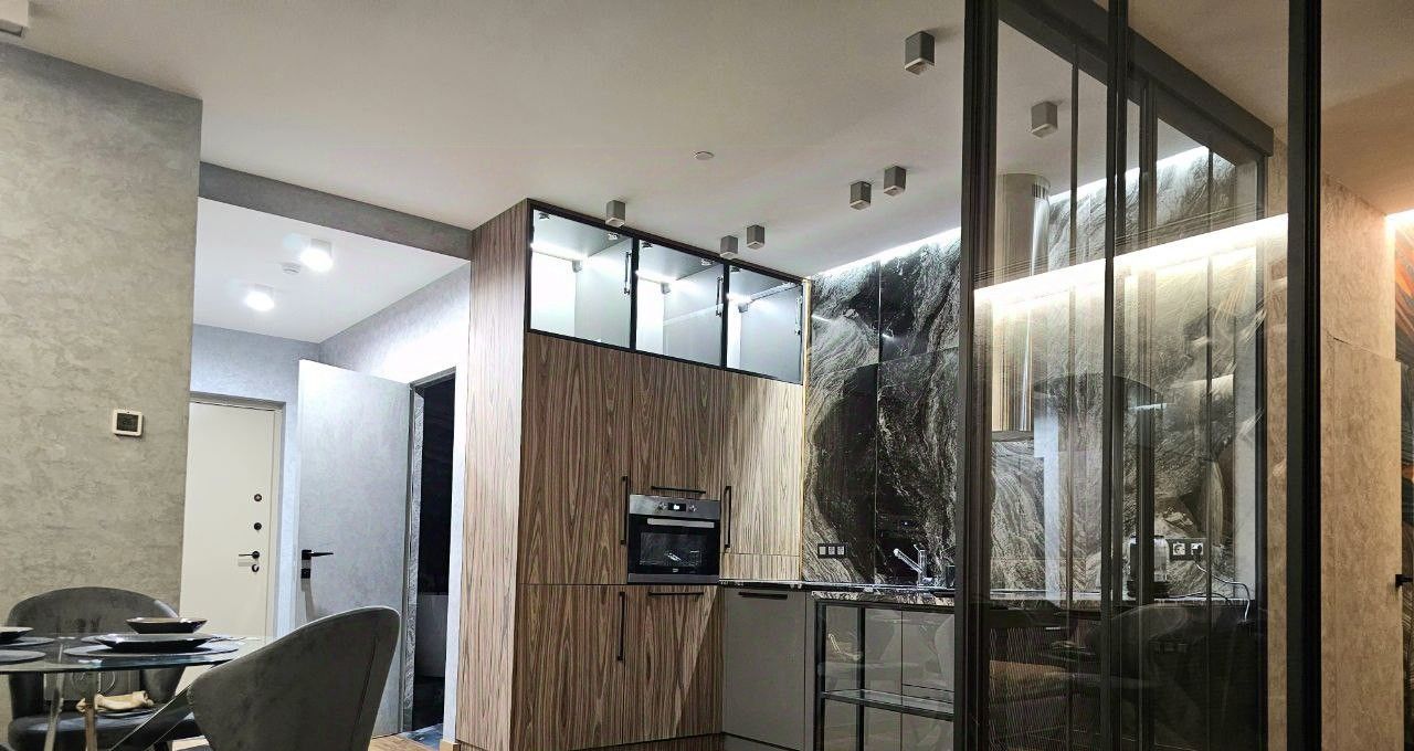 Кухня выполнена из натуральных материалов (Шпон и натуральный камень гранит) Посудомойка вместительная на 60 Полноразмерный встраиваемый холодильник, духовка, 2 телевизора, панорамные окна.