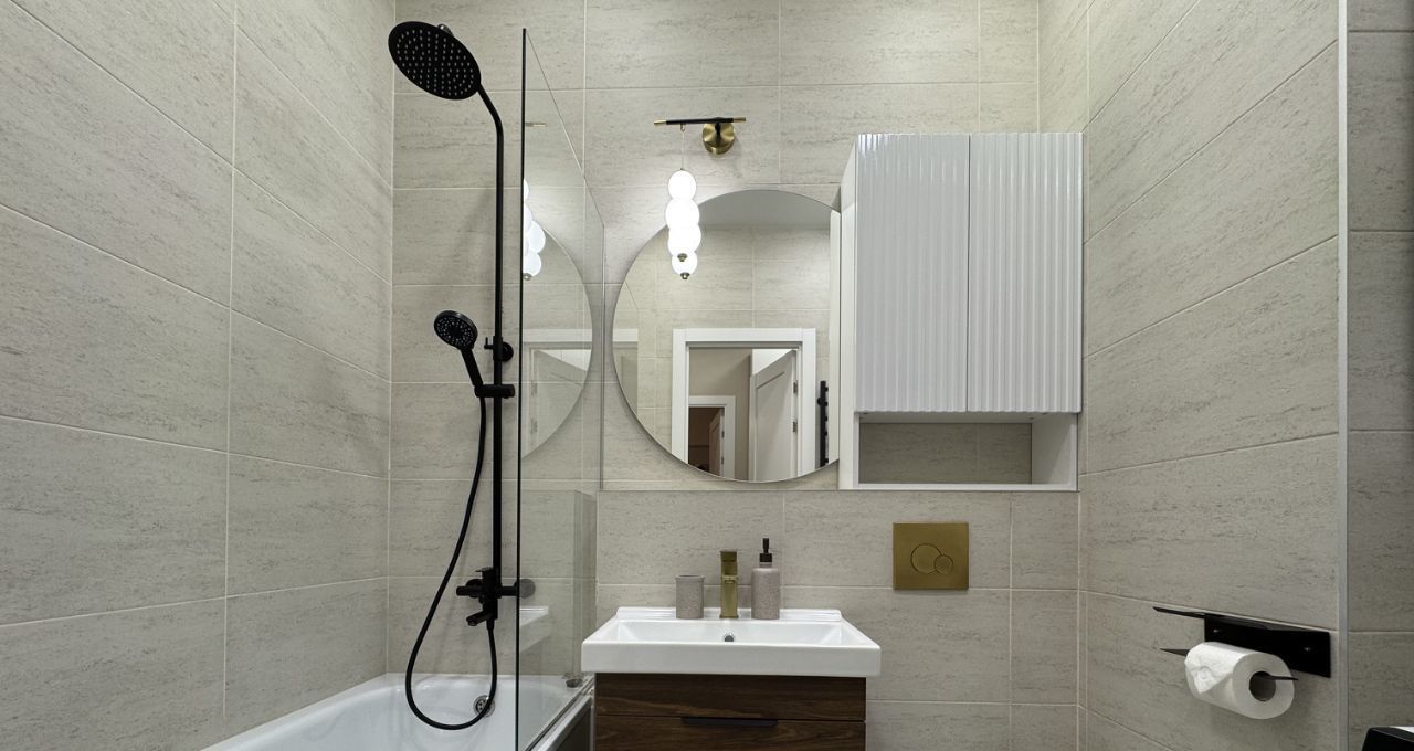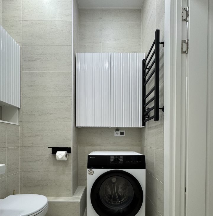 - Опрятная ванная комната Дополнительно присутствуют фен, утюг, сушилка. Стиральная машина с сушкой.