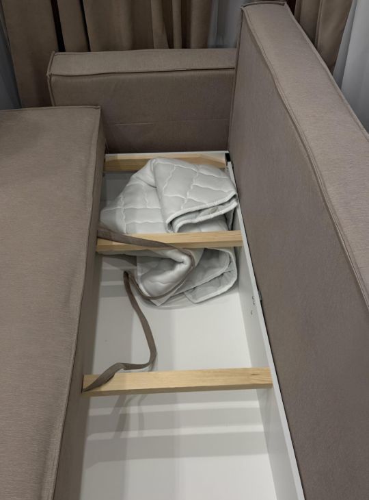 В зале диван раскладной, получается как большая кровать 160-200, в дополнении к нему есть матрас , спать удобно как на кровати. Места хранения очень много , 6-дверный шкаф в спальне , в зале 3-х дверный и в приходе 3-х дверный.