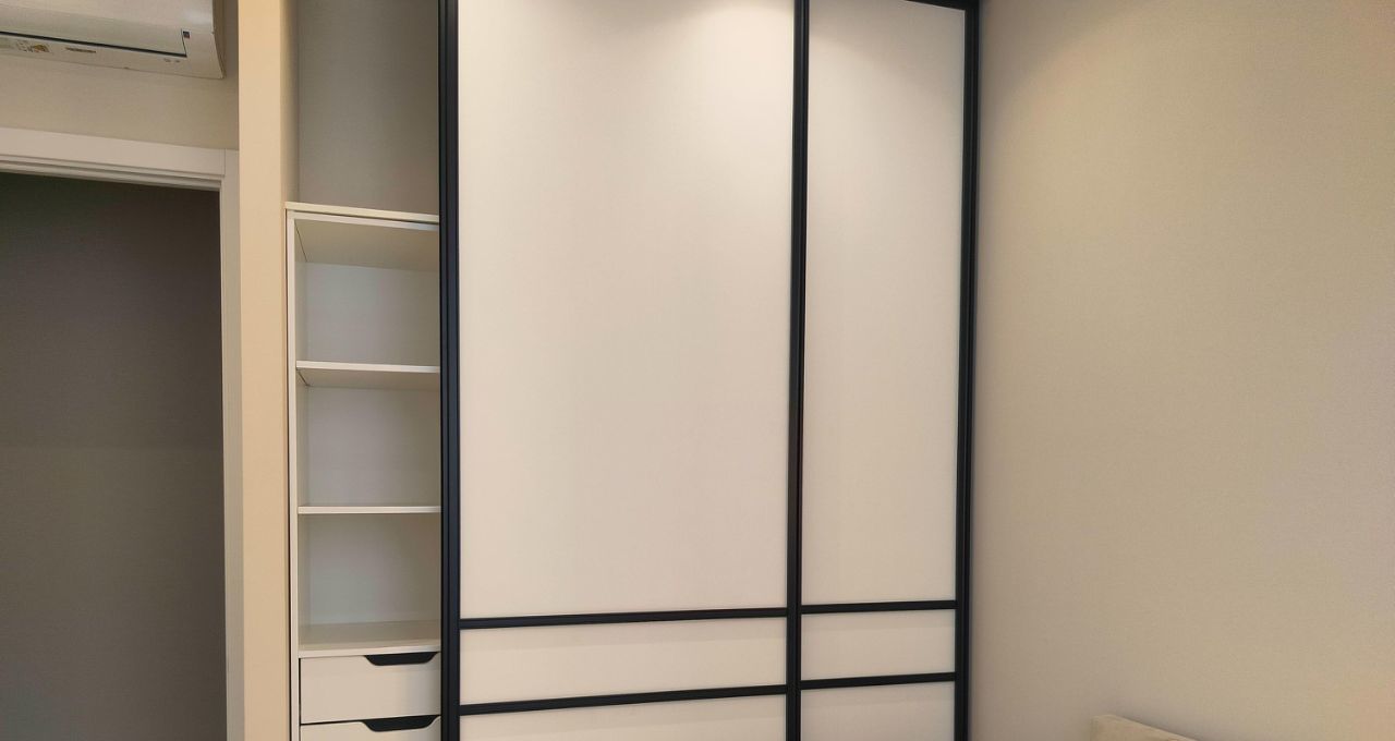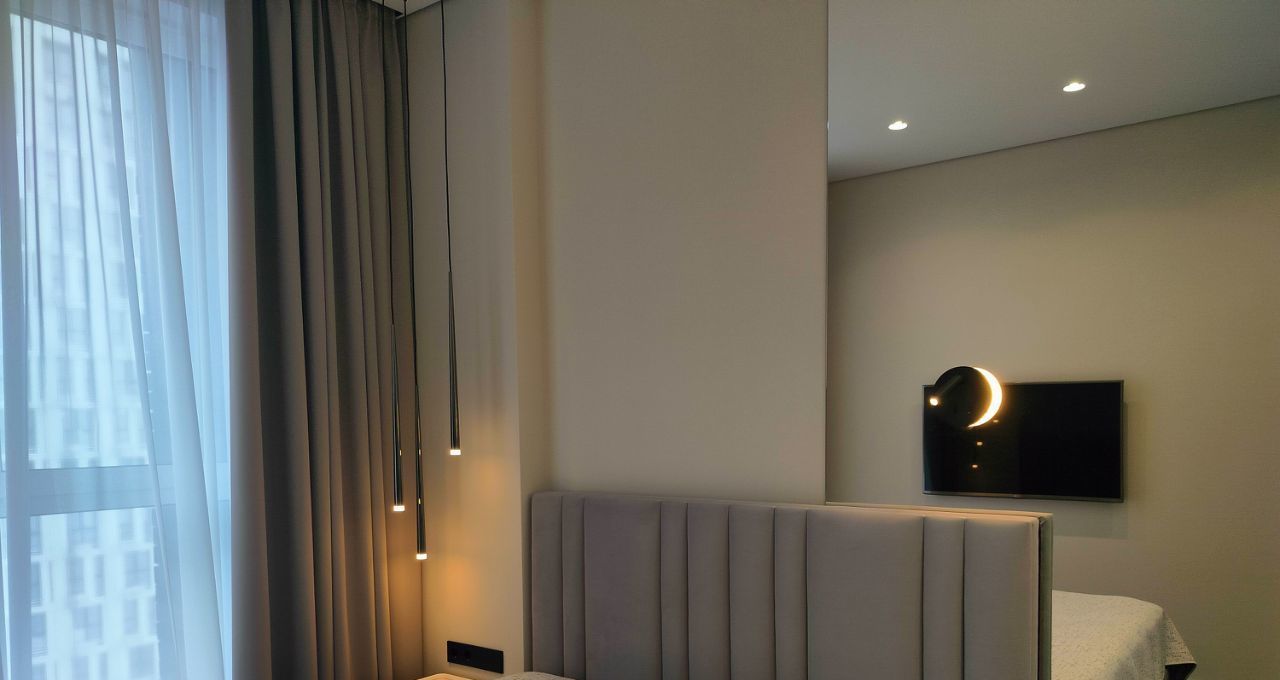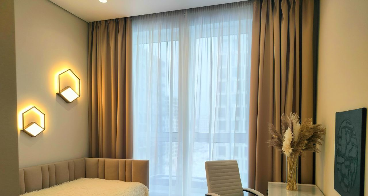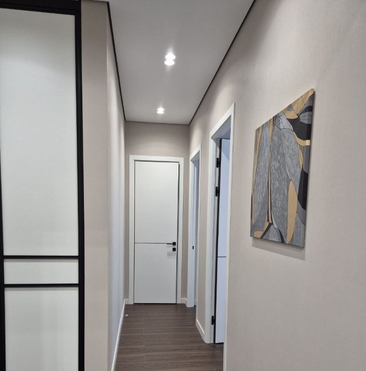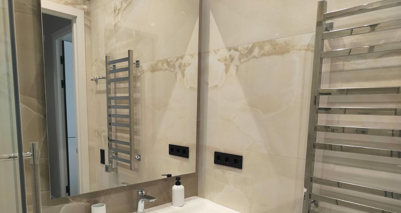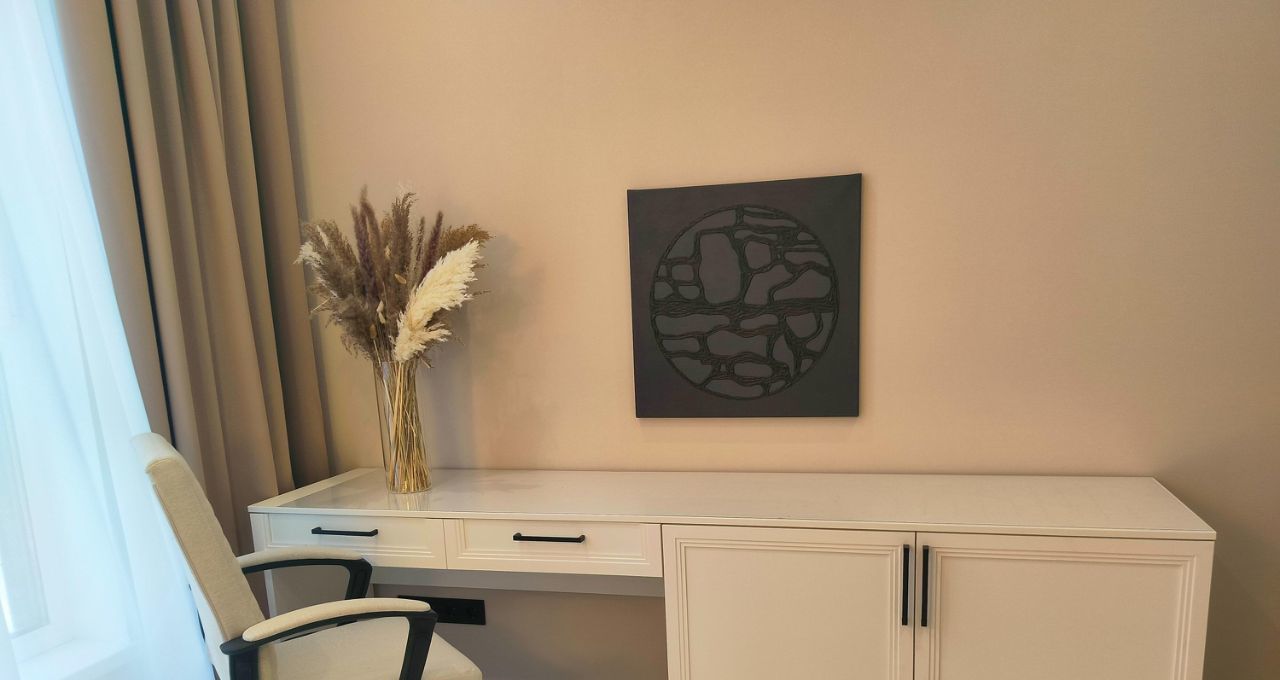 Выполнен качественный ремонт, квартира полностью меблирована и оснащена всей необходимой техникой: кондиционеры во всех комнатах, холодильник, посудомоечная и стиральная машины, телевизоры. В кухне и комнатах есть вся необходимая мебель для комфортного проживания, достаточное количестве мест хранения. Слева от входа в квартиру вместительная отдельная гардеробная комната. В ванной комнате установлена душевая кабина. Дополнительно имеется лоджия для отдыха или хранения вещей.