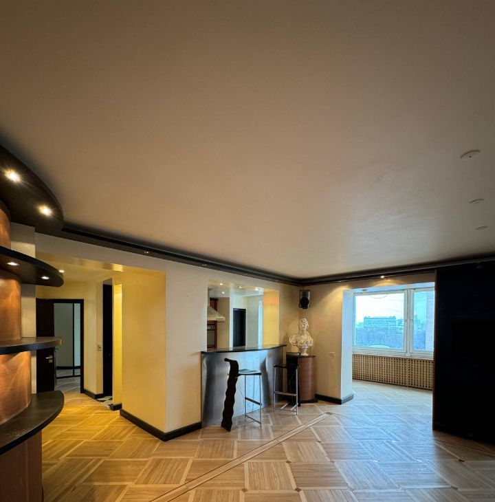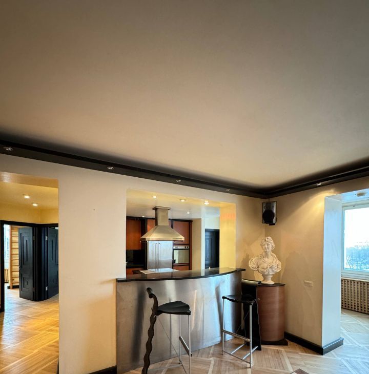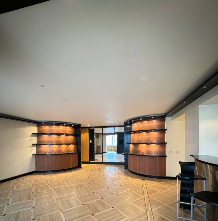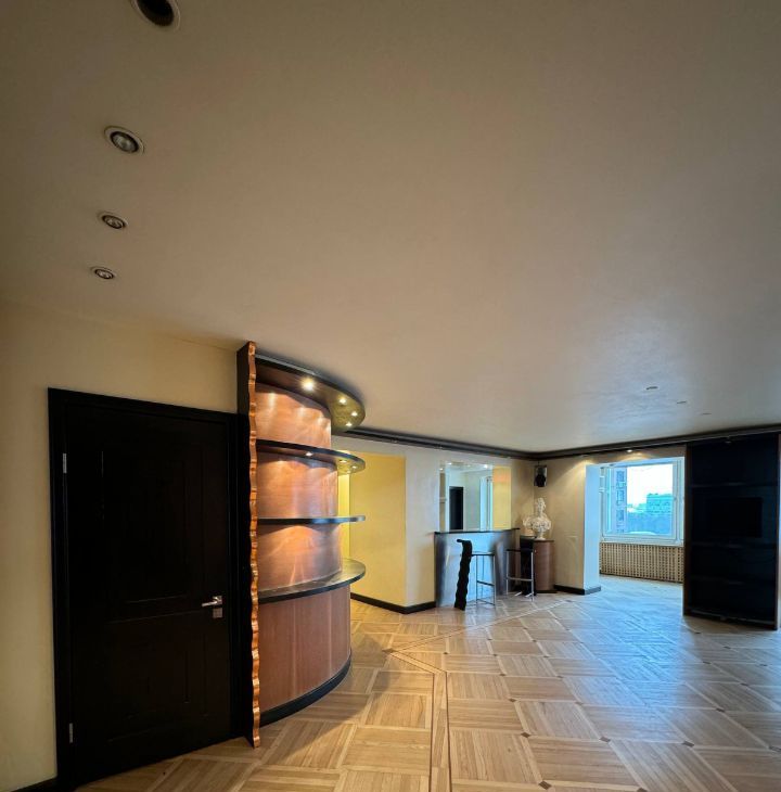 - Просторная гостиная 65 м² с симметричными полукруглыми стенами и эффектной галогенной подсветкой — идеальна для приема гостей и расслабления.