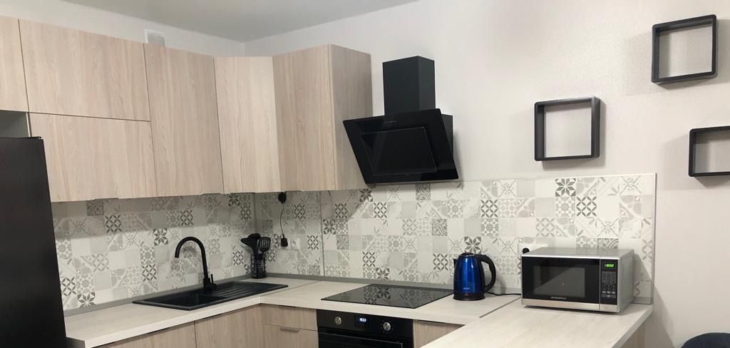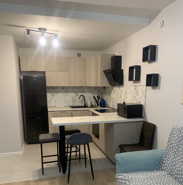 Квартира полностью меблирована: обустроенная кухня и уютная комната с мебелью. В наличии вся необходимая техника: холодильник, посудомоечная машина, телевизор и стиральная машина. Ванная комната оборудована ванной, что отлично подходит для расслабляющих вечеров.
