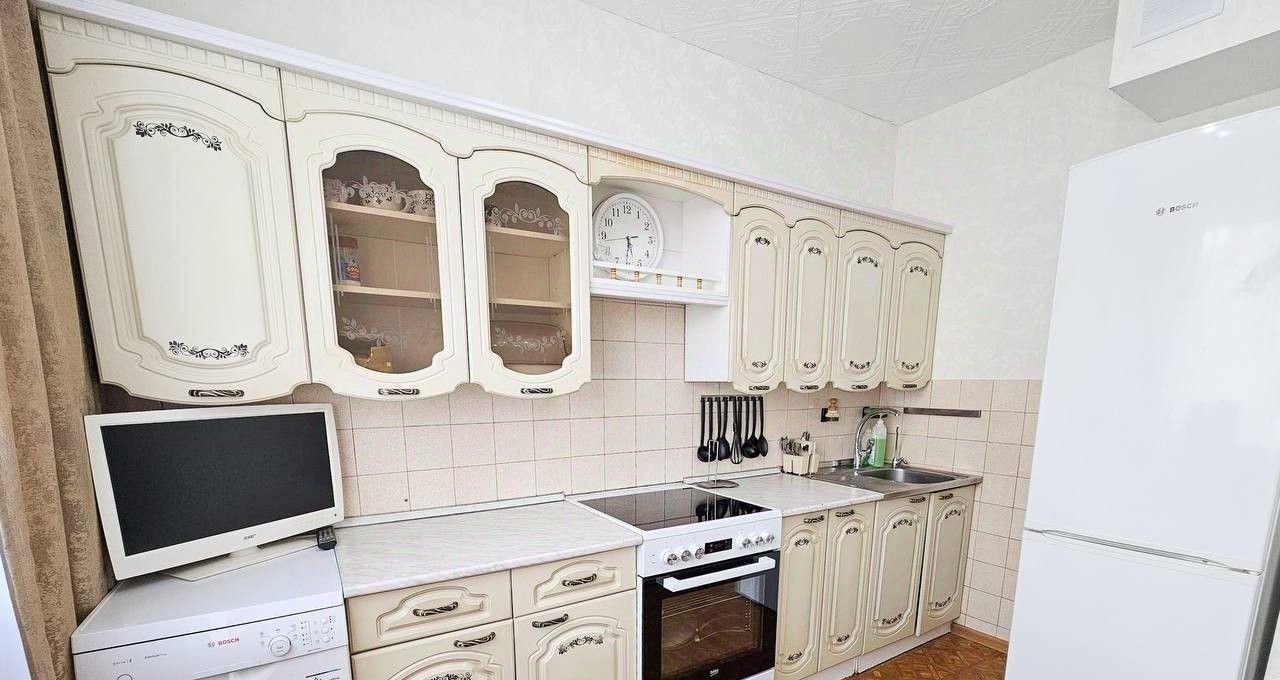 Кухня: гарнитур, посудомоечная машина Bosch, плита, холодильник Bosch, микроволновка, чайник, посуда