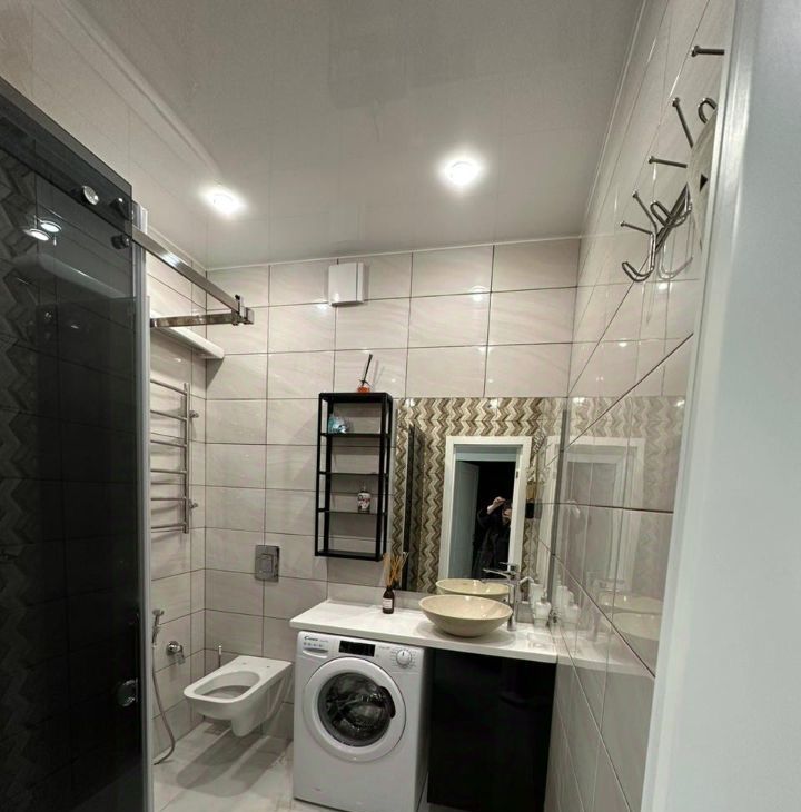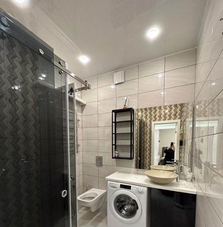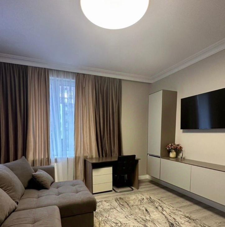 В квартире выполнен дизайнерский ремонт, что придаёт ей особый шарм и уют. Просторная жилая зона в 30 кв. м и кухня площадью 10 кв. м оборудованы всей необходимой мебелью и техникой: кондиционер, холодильник, посудомоечная и стиральная машины, телевизор. Санузел совмещённый, с душевой кабиной. Окна выходят во двор, поэтому в квартире всегда тихо и спокойно.