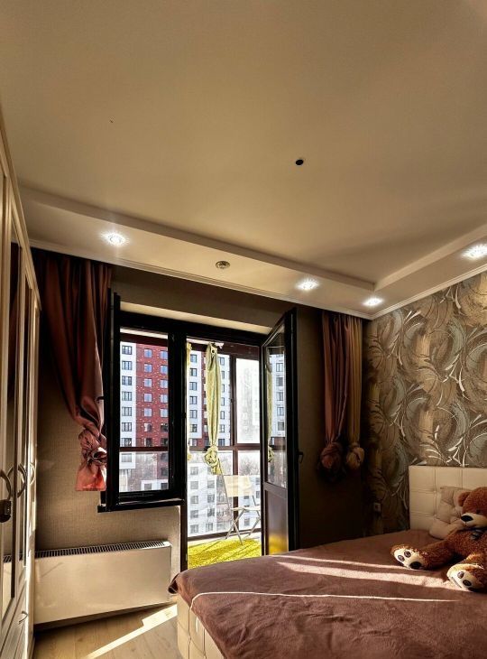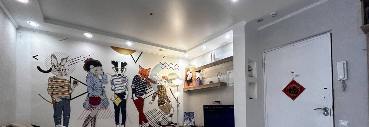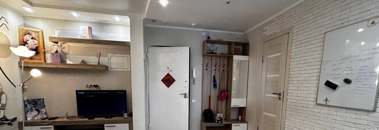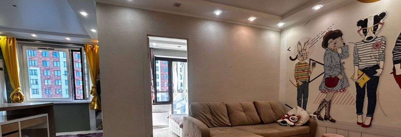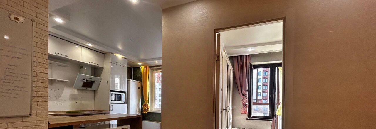Стильный интерьер с дизайнерским ремонтом грамотно зонирует пространство на уютную гостиную с угловым диваном и изолированную спальню. Остекление наполняет комнаты естественным светом и открывает вид с тринадцатого этажа на окрестности. Кухонная зона выделена барной стойкой и оснащена встроенной техникой включая духовой шкаф и микроволновую печь для удобства готовки. Стены украшены авторской графикой которая придает квартире индивидуальность и современный вид.