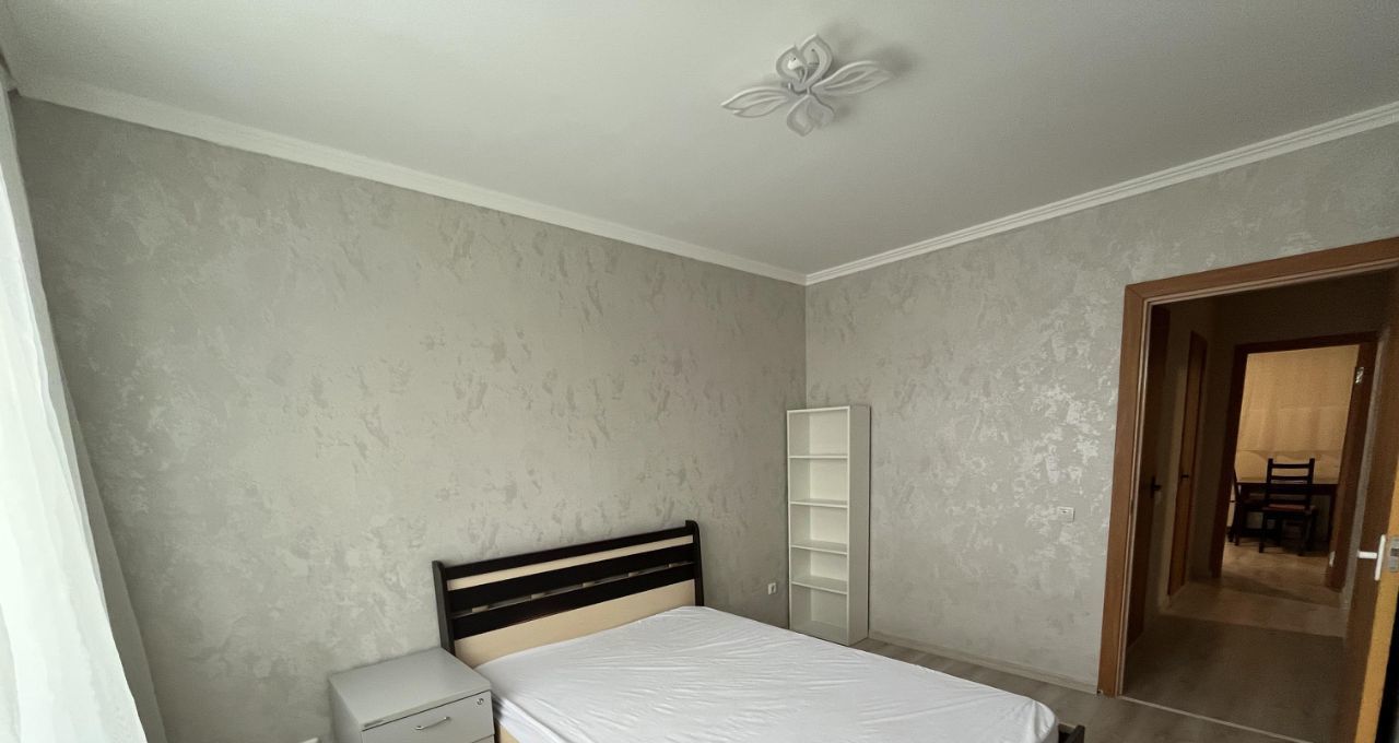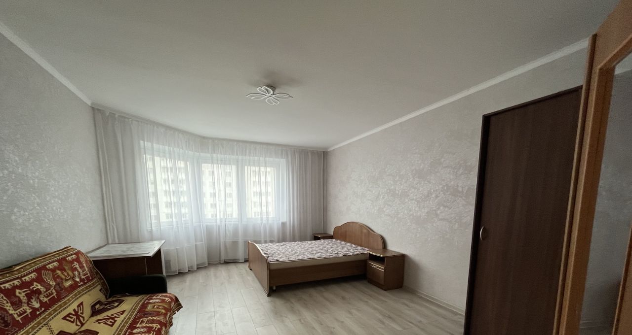 Большая комната: просторная двуспальная кровать, вместительный шкаф для хранения, раскладной диван, компьютерный стол — удобство как для отдыха, так и для работы.