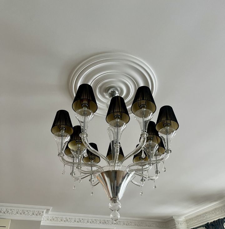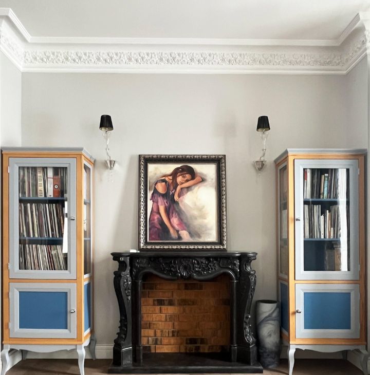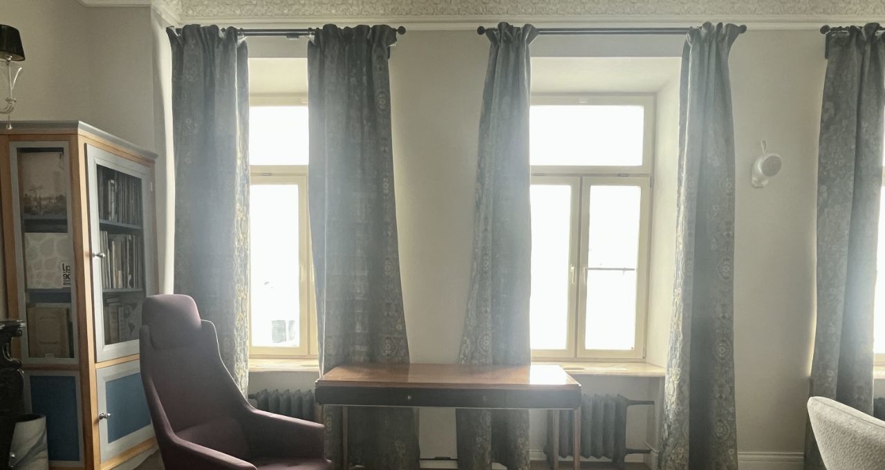 Правильная геометрия, высота 3,40 м, декоративный каминный портал из чёрного мрамора. Пространство позволяет комфортно зонировать зону отдыха и рабочую часть.
