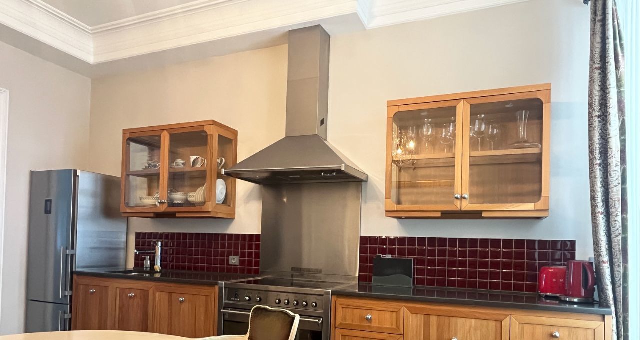 Кухня изготовлена по индивидуальному проекту с точным воспроизведением дизайна Le Cornue. Конструкция полностью из массива дуба — фасады, корпус и внутренние стенки. Фурнитура — Англия.