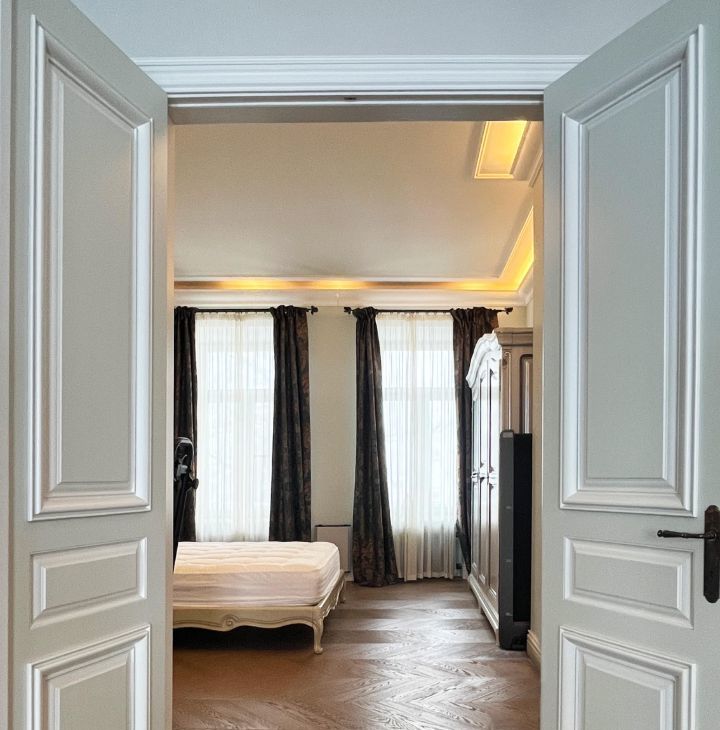 Во всей квартире, кроме санузлов, уложен массив дуба Coswick с укладкой французская ёлка крупного формата. Межкомнатные двери — индивидуальный заказ, массив дуба. Подоконники — мрамор (Италия). Окна дерево-алюминий с тройным стеклопакетом. В помещениях установлены декоративные чугунные радиаторы.