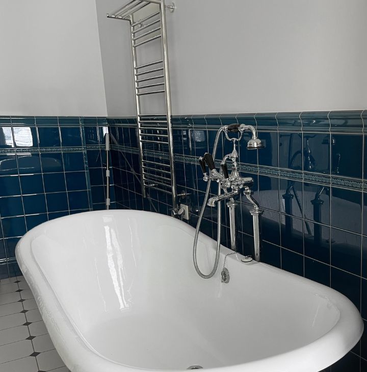 Сантехника Devon&Devon. Отдельная ванна и душевая кабина, унитаз и биде. Есть гостевой санузел. Мебель — массив дуба. Тёплый пол.