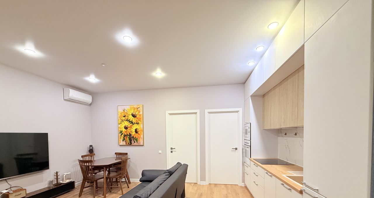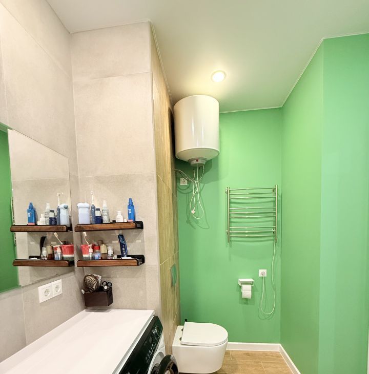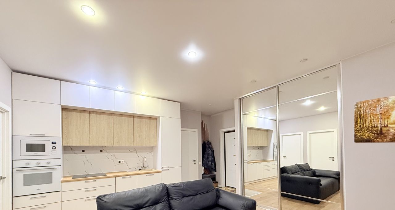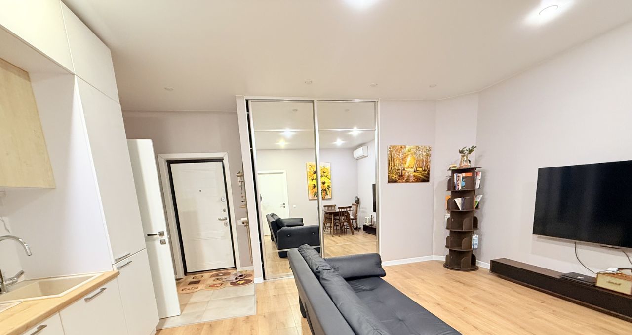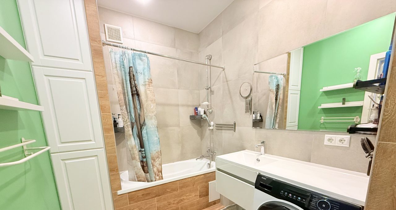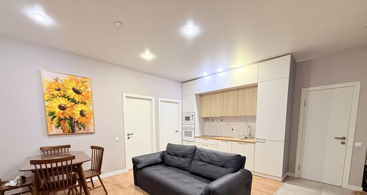 В квартире выполнен евроремонт, благодаря которому она выглядит стильно и уютно. Жилая площадь составляет 25 кв. м, а просторная кухня занимает 20 кв. м, что отлично подходит для любителей готовить. Квартира полностью меблирована: есть мебель на кухне и в комнате. Из техники в распоряжении арендаторов будут холодильник, посудомоечная и стиральная машины, а также телевизор. Санузел совмещённый, с ванной, окна выходят во двор, что обеспечивает тишину и спокойствие.