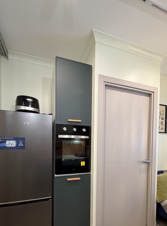 Встроенная бытовая техника: посудомоечная машина, духовой шкаф, вытяжка, варочная панель, стиральная машина, холодильник.
