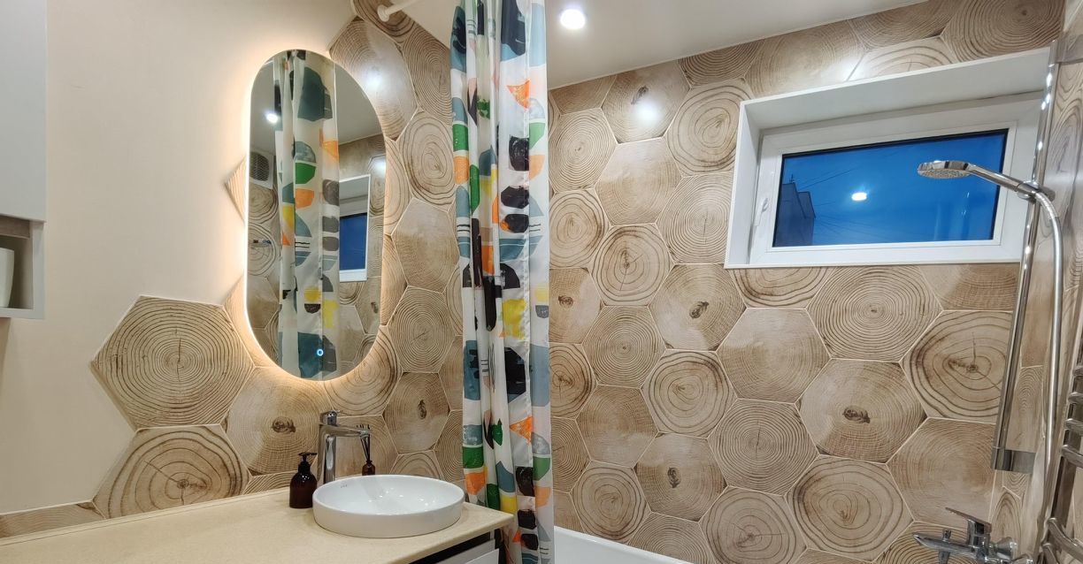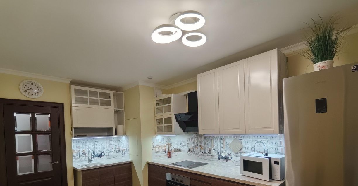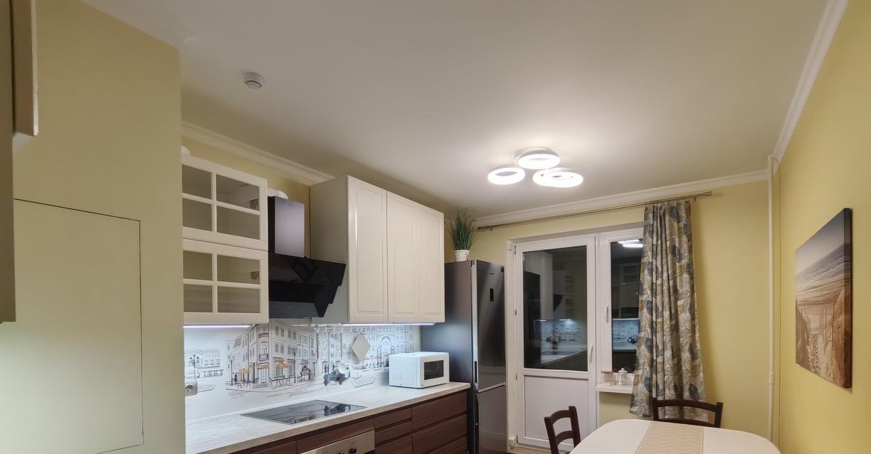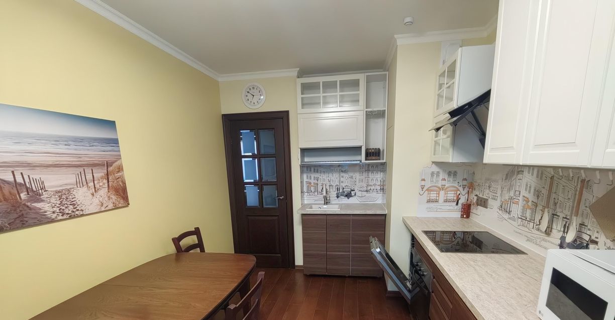 Кухня оборудована техникой Samsung, Siemens, есть большой раскладывающийся дубовый стол и полностью застеклённый балкон, раздельный санузел — Laufen и Hansgrohe, надёжная стиралка с паром и защита от протечек. Много мест для хранения, полы из инженерной доски, а подоконники из искусственного камня.