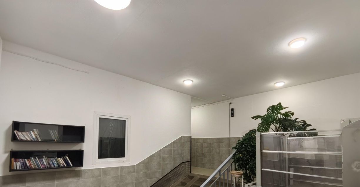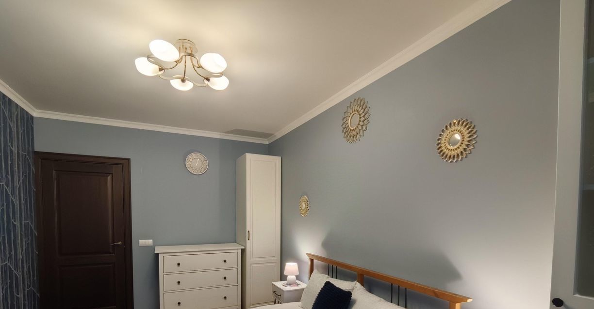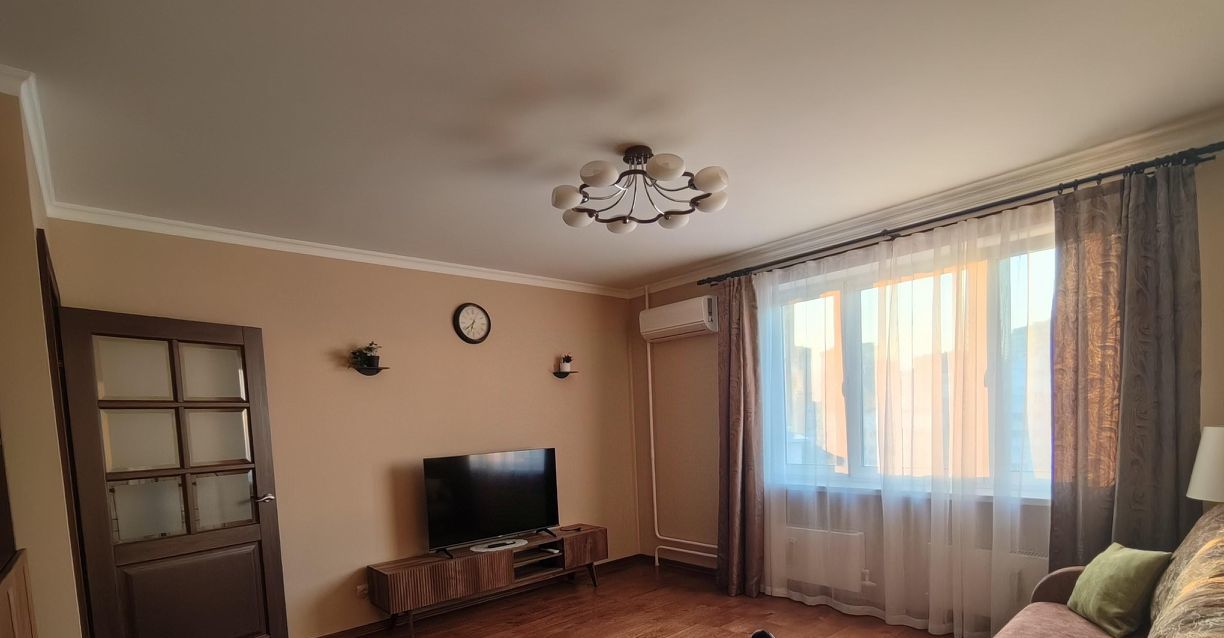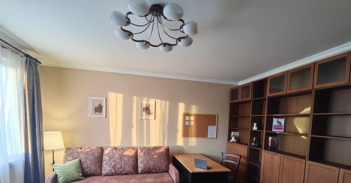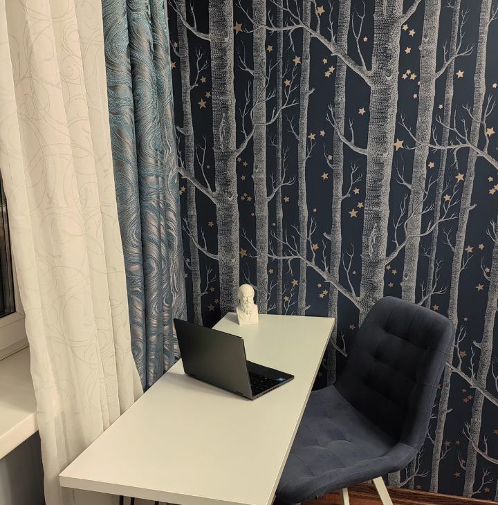Проведён интернет, есть два письменных стола для удалёнки или учёбы, полноценные книжные шкафы для домашней библиотеки. В гостиной установлен кондиционер, большой умный телевизор, диван-кровать, в спальне кровать с ортопедическим матрасом, но вообще наполнение обсуждается.