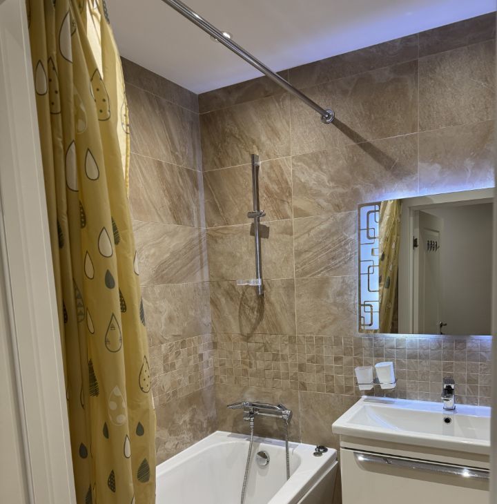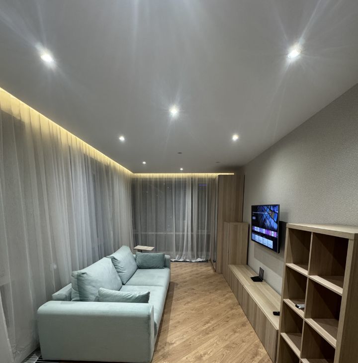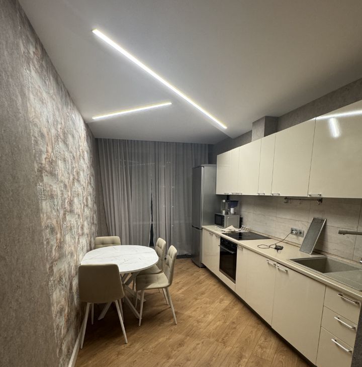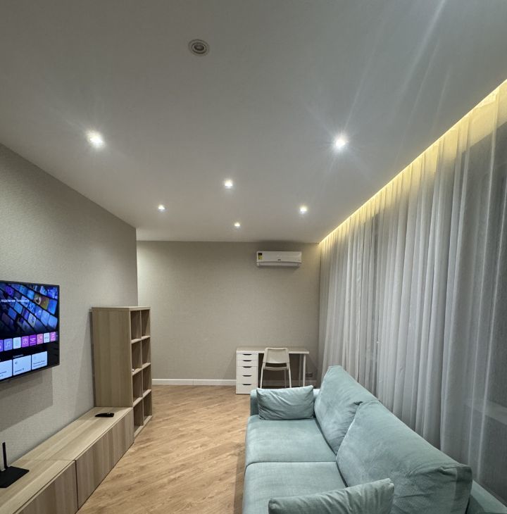В квартире есть всё необходимое для комфортного проживания: современная мебель на кухне и в комнате, кондиционер, холодильник, телевизор и стиральная машина. Санузел раздельный, в ванной комнате установлена ванна. Интерьер выполнен в светлых тонах, что создаёт ощущение простора и уюта.