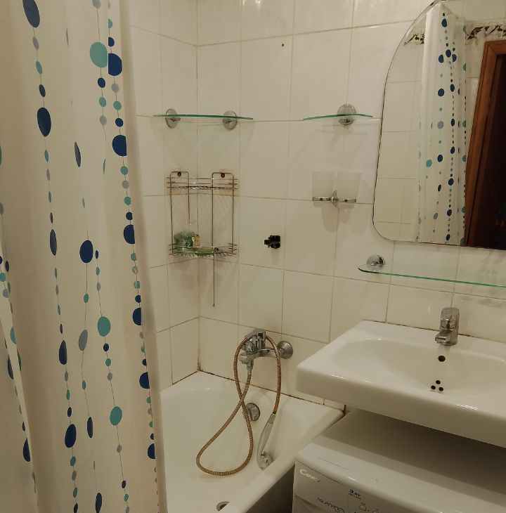 Санузел раздельный, оснащен ванной и стиральной машиной. В прихожей предусмотрены удобные шкафы для хранения вещей.